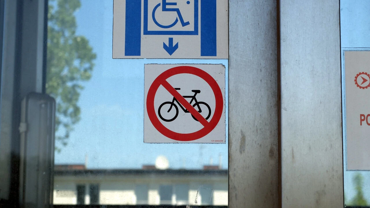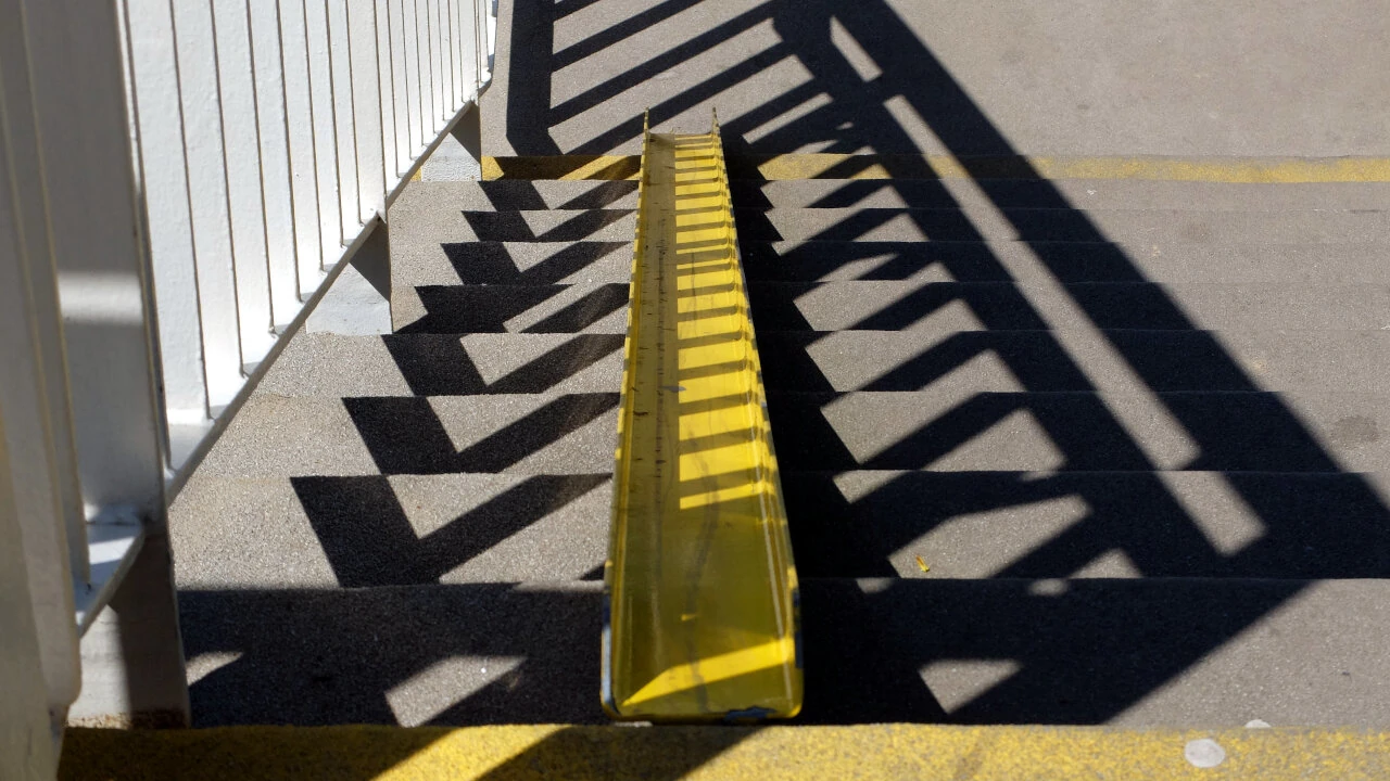 Mało honorowo, ale za to skutecznie, pokonujemy Płowiecką za pomocą kładki. Jaki geniusz projektowania uznał, że da się sprowadzić rower ze stromej kładki po takiej szynie? A podnośnikiem — bo to nawet nie winda — rowerem nie wolno.