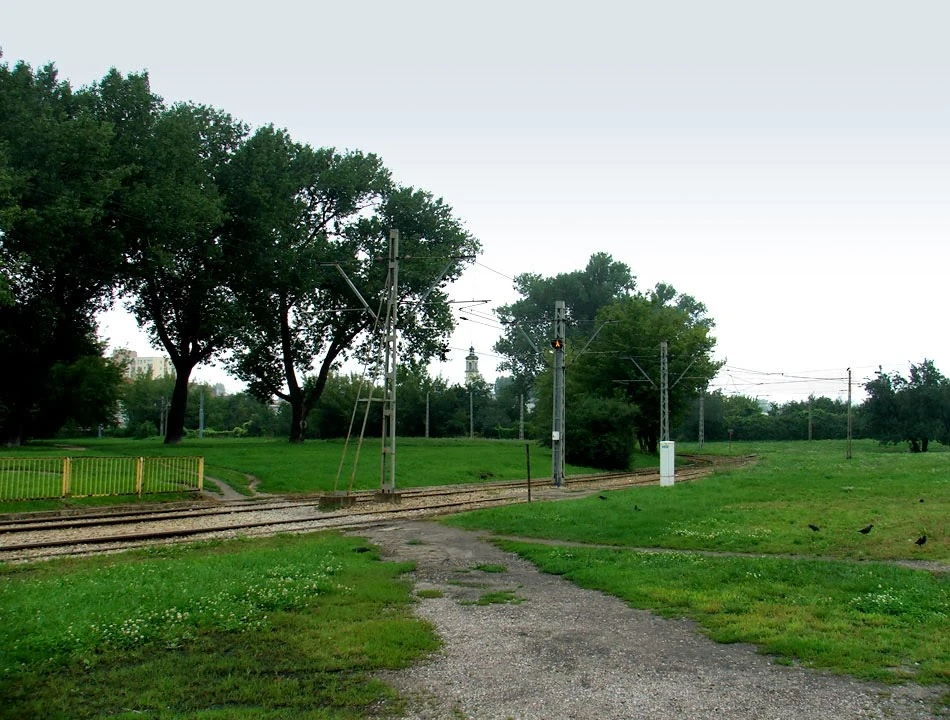 Jedziemy wzdłuż Kijowskiej, która kończy się na trawniku, ale to nie przeszkadza tramwajowi, który przez trawę dziarsko jedzie w kierunku bazyliki na Kawęczyńskiej.