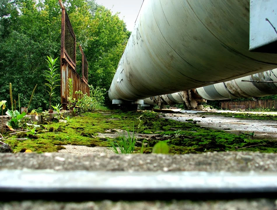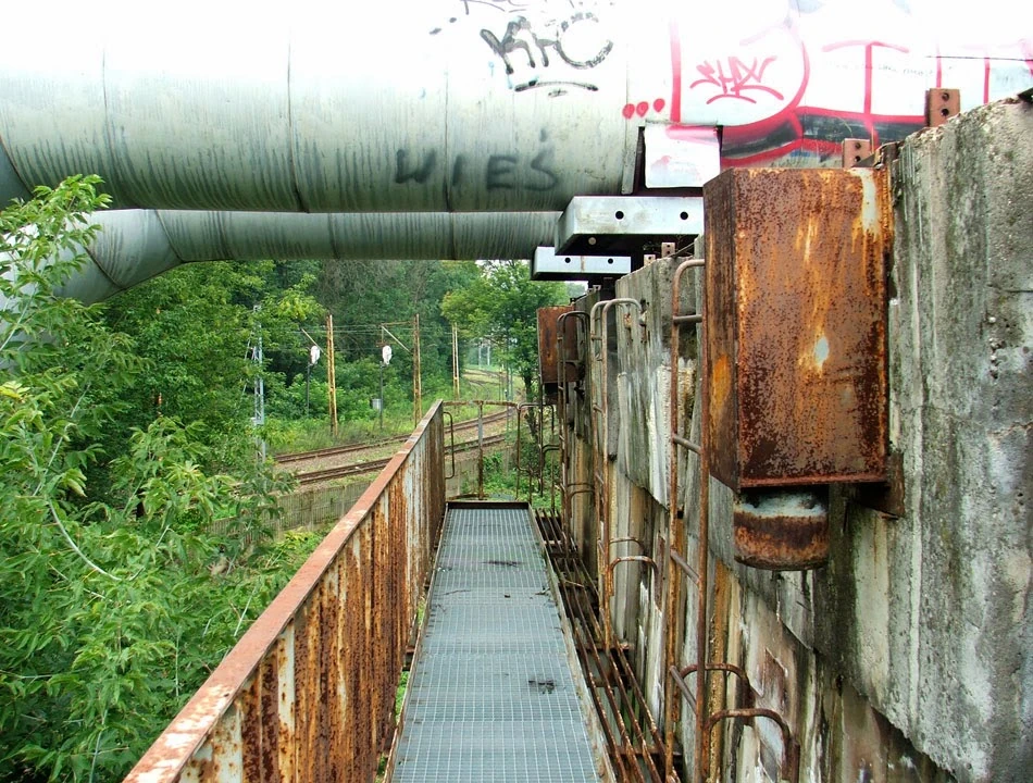 Wokół chaszcze i rury ciepłownicze biegnące po ziemi od elektrociepłowni Kawęczyn. Trochę drogą, gdzieniegdzie ścieżkami, docieramy do kolejnych torów i wiaduktu, który przenosi rury nad torami. Dzięki temu i my możemy przejść przez tory. Ciekawie wygląda sam wiadukt, a i widok z góry zajmujący. Wszystko w sosie industrialno-dekadenckim.