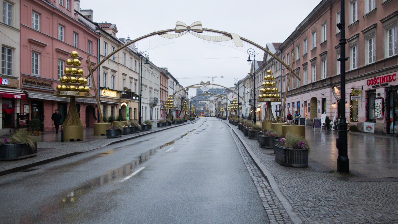 Najpierw Nowy Świat, bo to dojazd do Placu Trzech Krzyży. Na Trakcie Królewskim świątecznie; w tym roku złoto. Pusto, bo w weekendy jest tu deptak z ruchem rowerowym. Pięknie byłoby, gdyby tak przez cały rok Nowy Świat oddać poruszającym się wolniej.