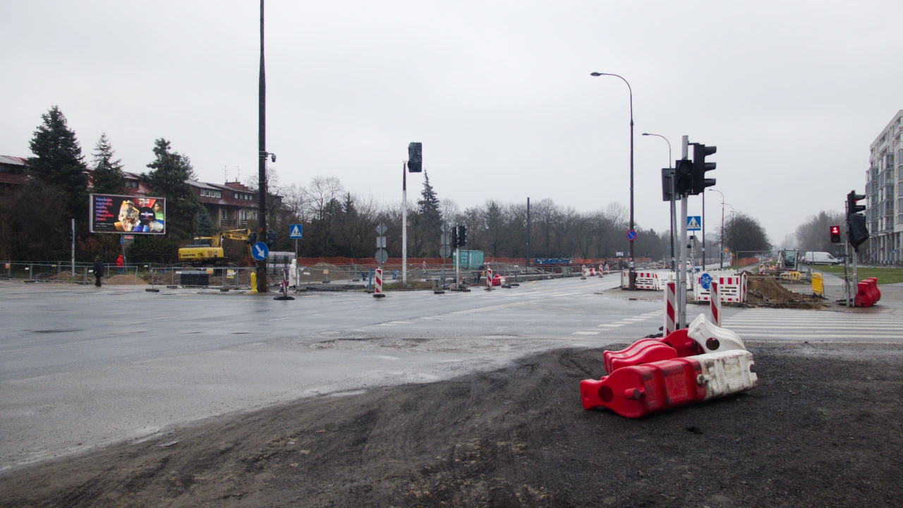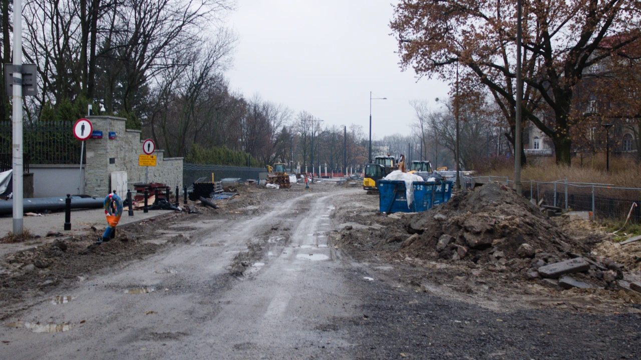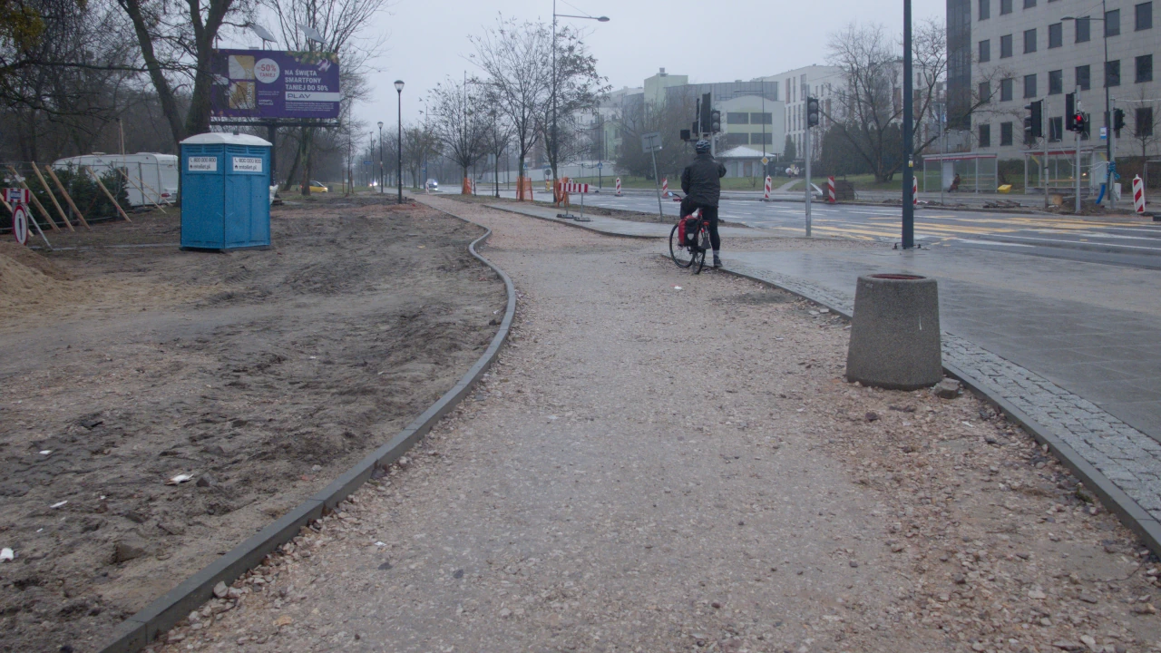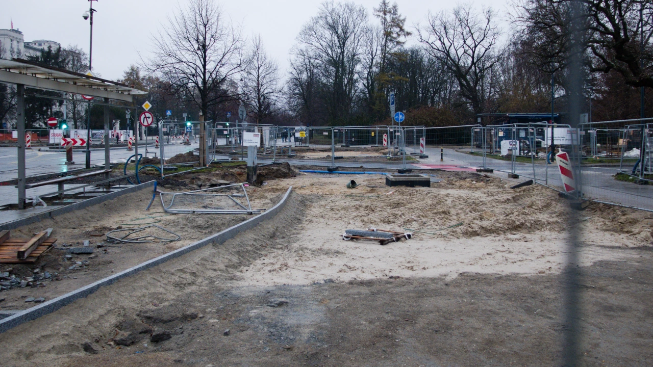 Tu także rycie w ziemi trwa. Gdzieś tu miał powstać kawałek drogi dla rowerów przy pętli tramwajowej; ale obie te inwestycje jeszcze nie powstały.
