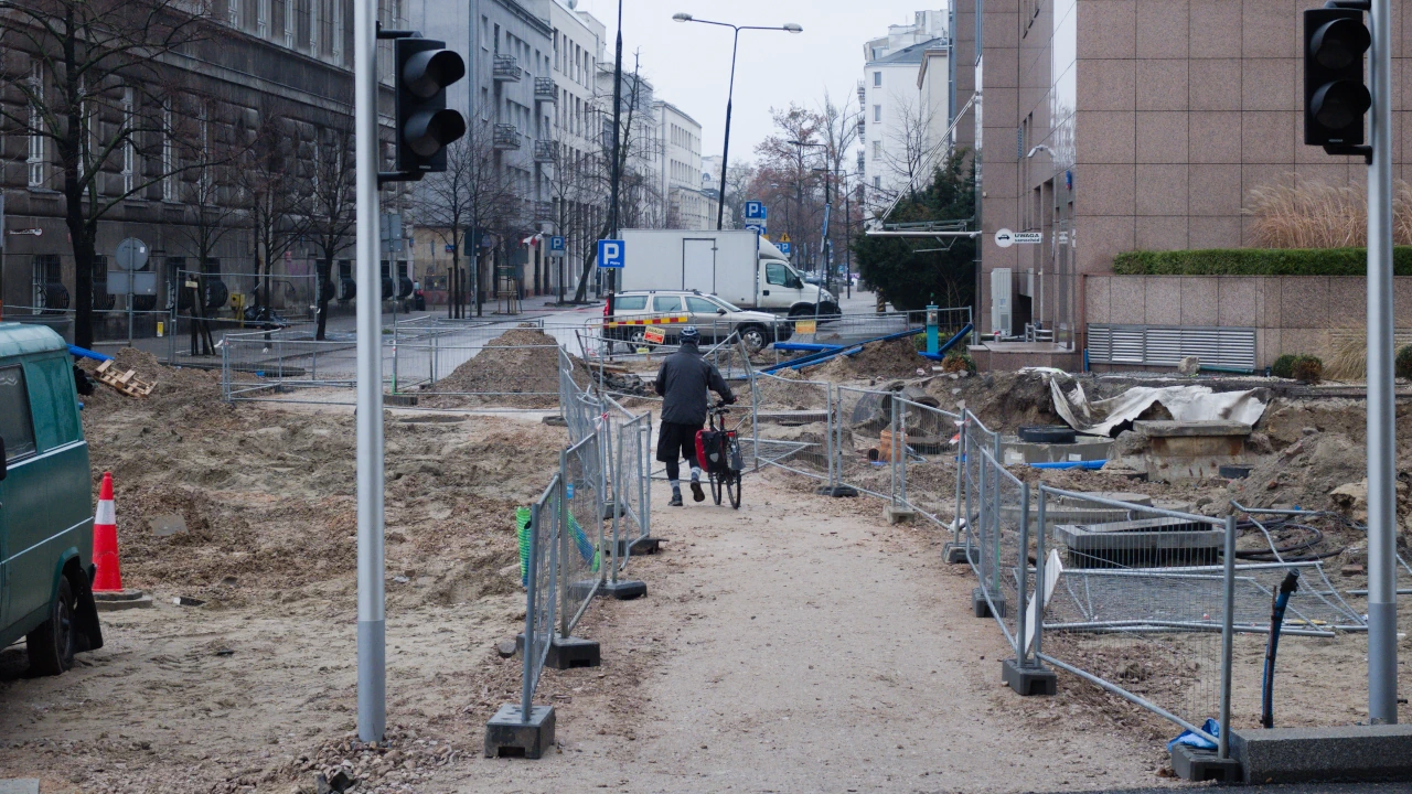 Jedziemy do Placu Unii Lubelskiej zobaczyć, jak postępy przy budowie linii tramwajowej do Wilanowa. Poza trasą dla tramwajów, mają tam powstać drogi dla rowerów. Ale na razie na Goworka i Spacerowej pełna rozpierducha. Nie daje się tam chodzić, na rowerze też słabo.