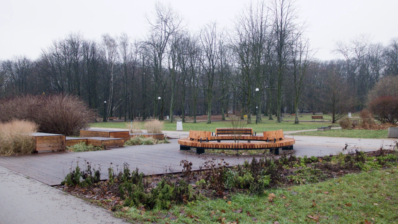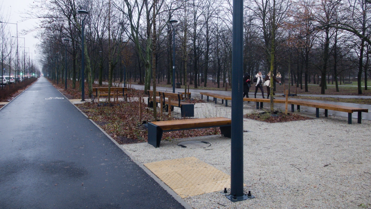 Przy parku Bródnowskim i obok drogi dla rowerów, zaprojektowano fajne miejsca do odpoczynku. Szkoda tylko, że ławki nie mają zgodnych z warszawskimi standardami podłokietników – niektórym ludziom trudno będzie z nich wstawać.