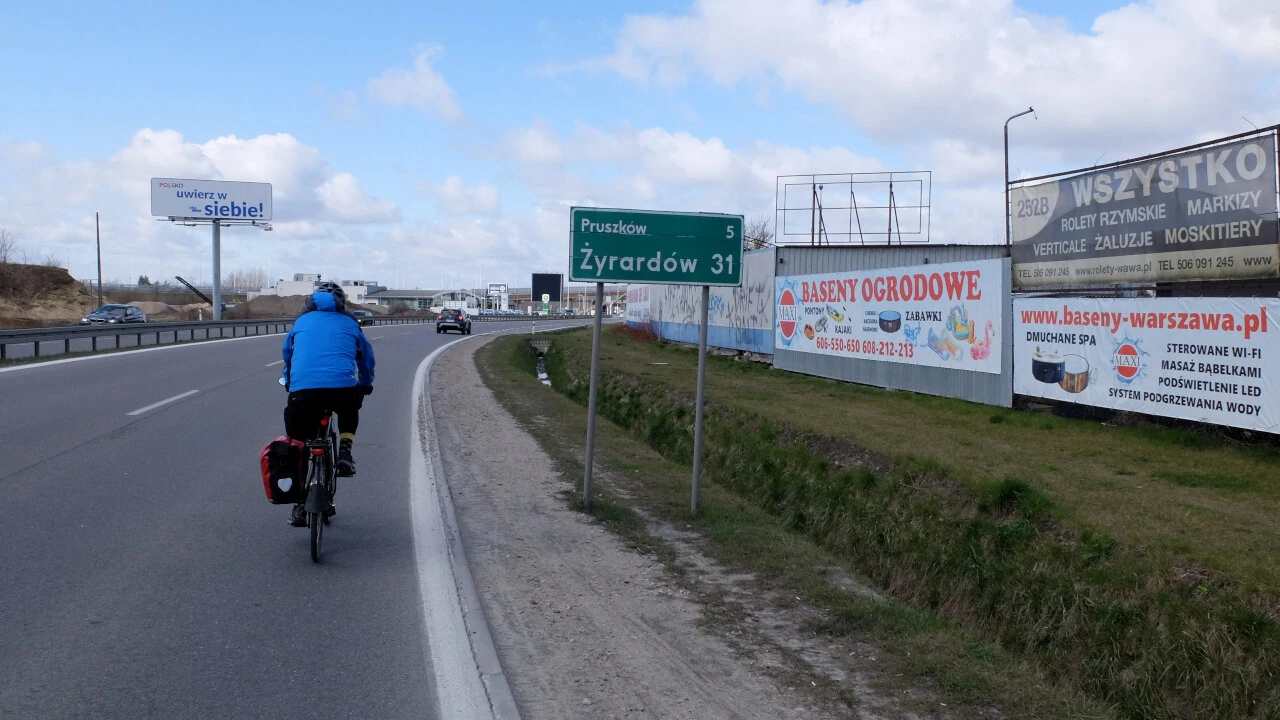 W Piastowie przejeżdżamy przez Bąki, a do Pruszkowa wjeżdżamy przez Żbików – tu na Jarzynowej mieszka znajoma Piotrka. Machamy jej przez okno, chyba jeszcze śpi, na kawę wprosimy się następnym razem. Piotrek wie, że musi wymyśleć sobie inna trasę do Pruszkowa, spokojniejszą, może prowadzącą przez Ursus?