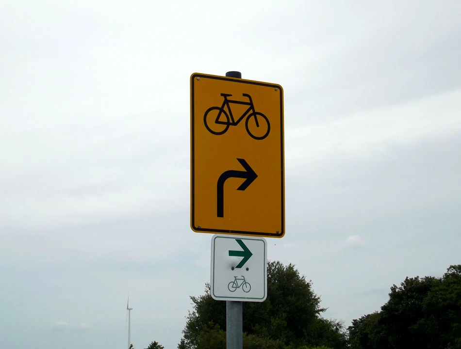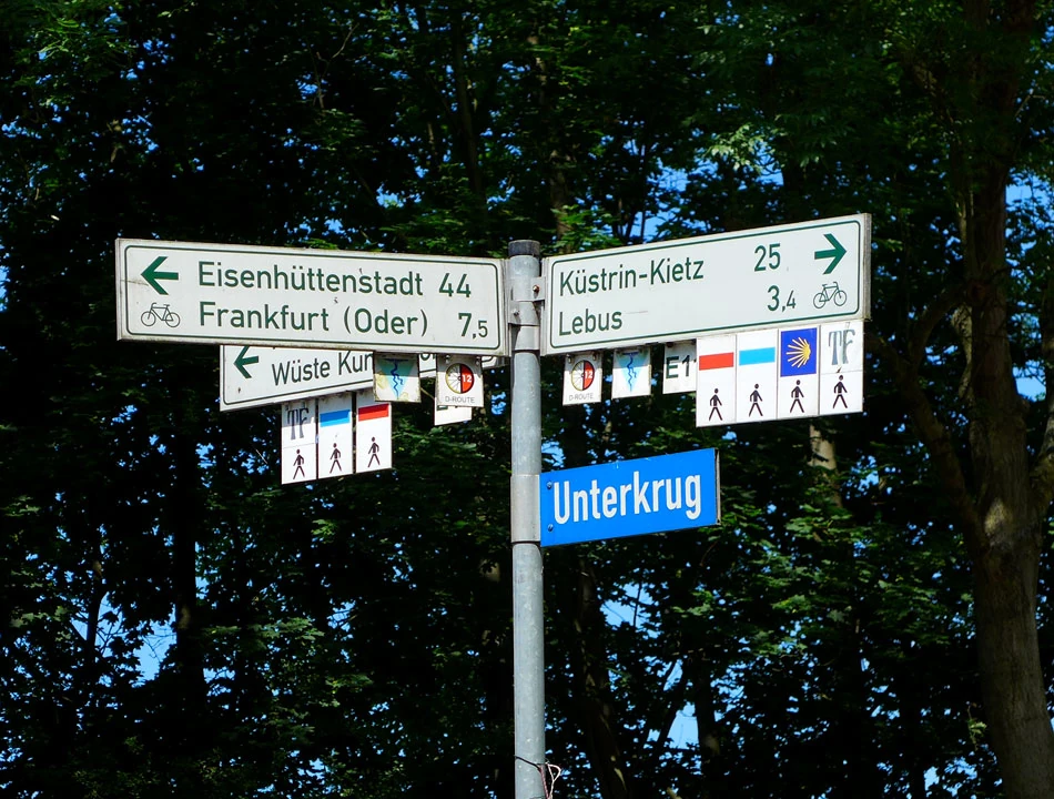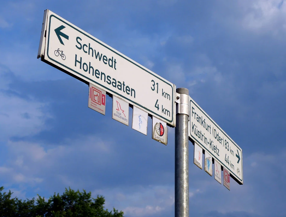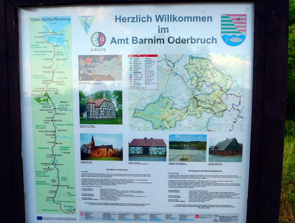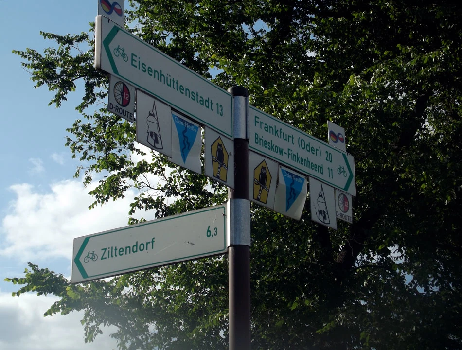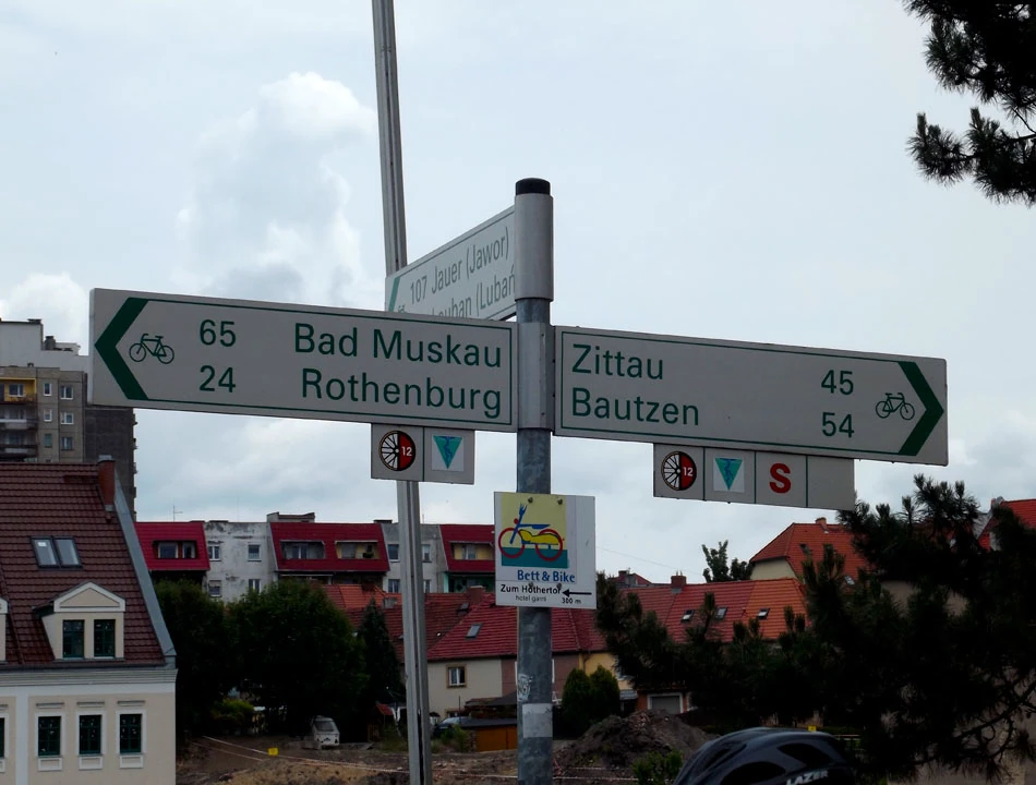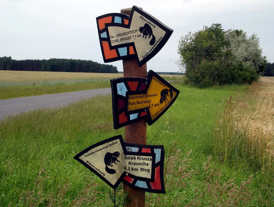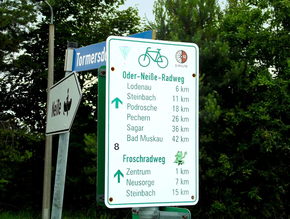 Przekraczamy granicę. Brzmi groźnie, ale dzieje się niezauważalnie. I od razu pojawiają się oznakowania tras rowerowych. Jasno, klarownie — nie trzeba zajmować się nawigowaniem. Mieliśmy taką nadzieję, jednak rzeczywistość jest piękniejsza od wyobrażeń — jedziemy jak po sznurku. Na drogowskazach jest wszystko. Symbol drogi, którą się jedzie — w naszym przypadku to trójkącik z symbolicznie przedstawioną Nysą i Odrą, wzdłuż której jedziemy. Odległość do dwóch najbliżej położonych miejscowości. Oznaczenia kierunku ruchu dla rowerów. Informacja gdzie trasa skręca oraz jak skorzystać z objazdów.