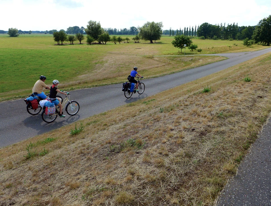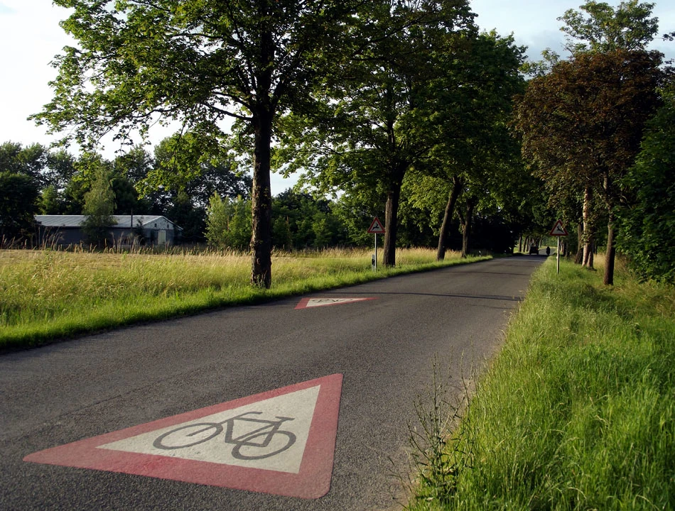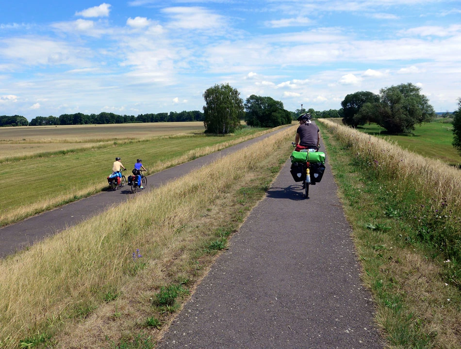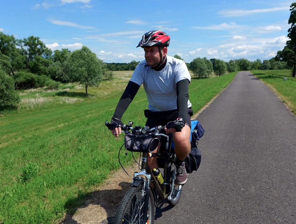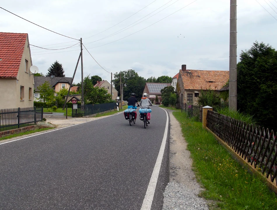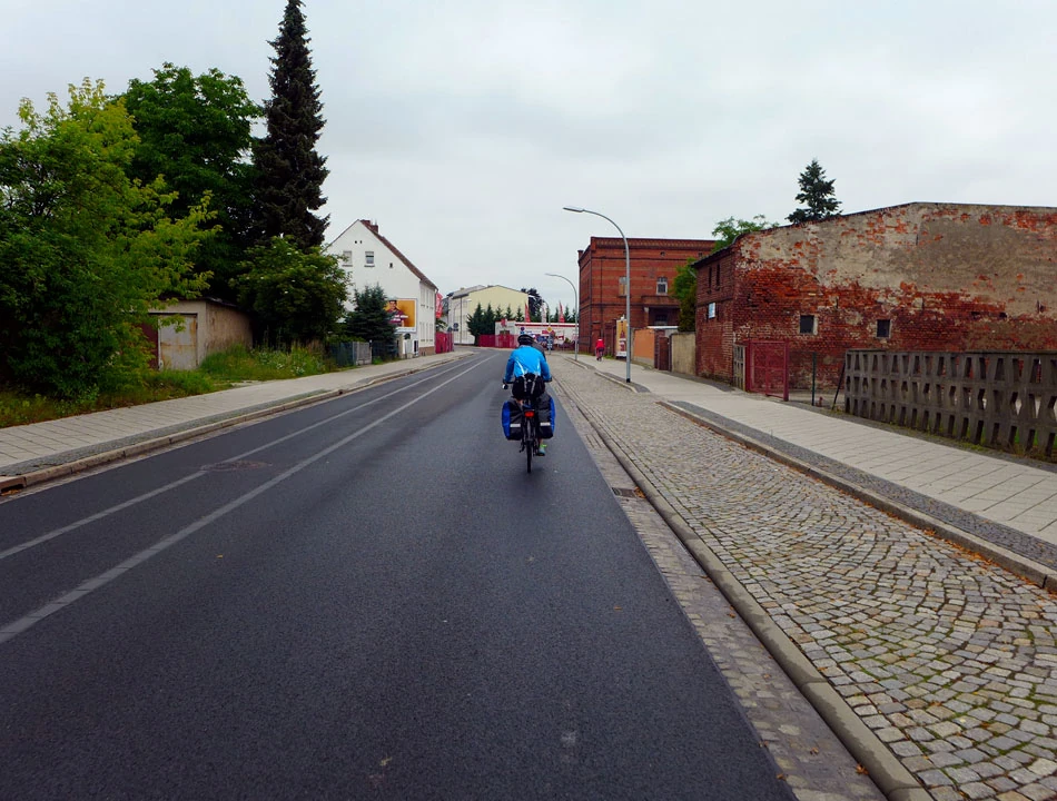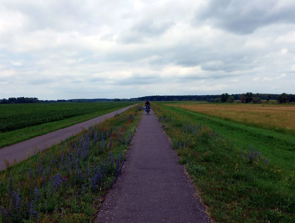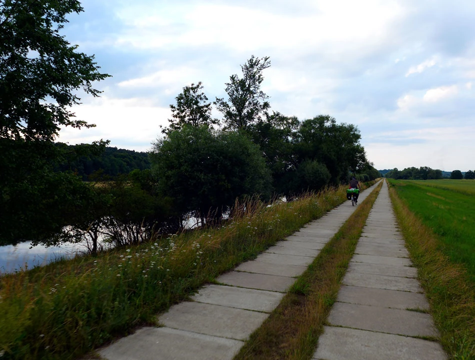 Droga nadal świetnej jakości. Zastanawiamy się czy trudno będzie wrócić nam do realiów polskich rozwiązań. W ogóle to jest dziwna sprawa. Podróżujemy ledwie 500 metrów od naszego kraju, a jednak po tej stronie rzeki wiele rzeczy jest innych. Milsi, mniej napięci ludzie, pozdrawiający nas na trasie przyjaznym haloo. Czyste i bez dziur ulice, mniejszy i spokojniejszy ruch, no i ta rowerowa infrastruktura.