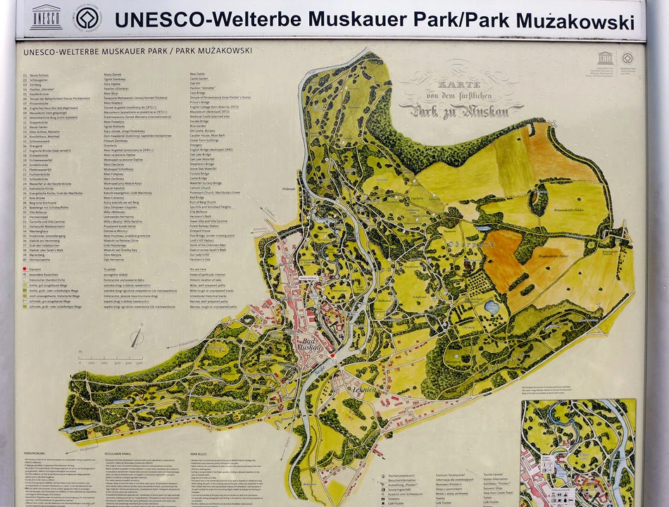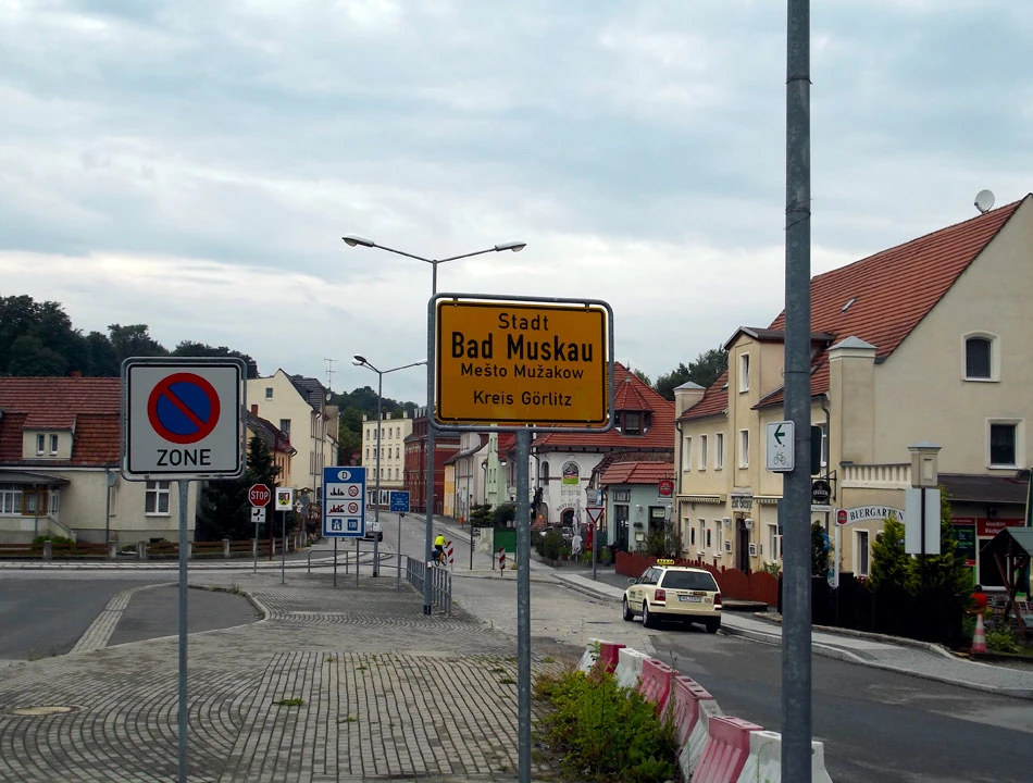 Przestaje padać, a my wjeżdżamy do Bad Muskau — Mużakowa — Mešto Mužakow. Malownicze miasteczko znane jest głównie z parku w stylu angielskim, wpisanego na listę Unesco. Kiedyś Mużaków tworzył jedno miasto z Łęknicą. Dzisiaj park, mający ponad 700 hektarów powierzchni, podzielony jest granicą państwową. Ponad 500 hektarów jest na terenie Polski, a przez park płynie rzecz jasna Nysa. Obecność Serbołużyczan widać do dzisiaj w nazwach ulic.