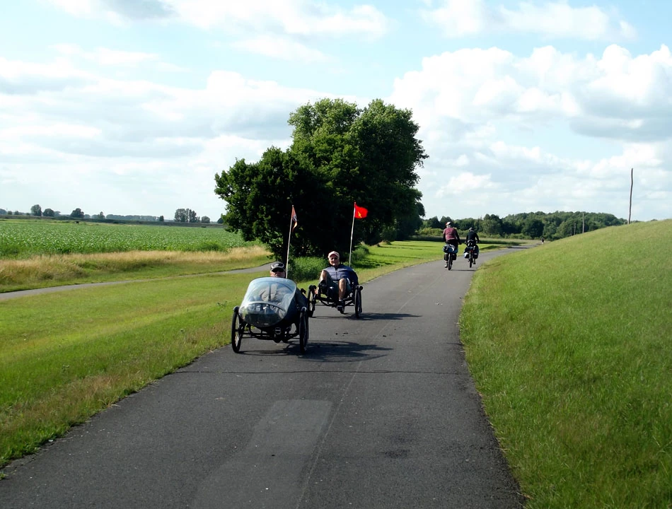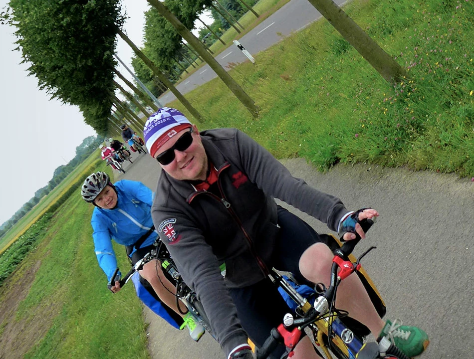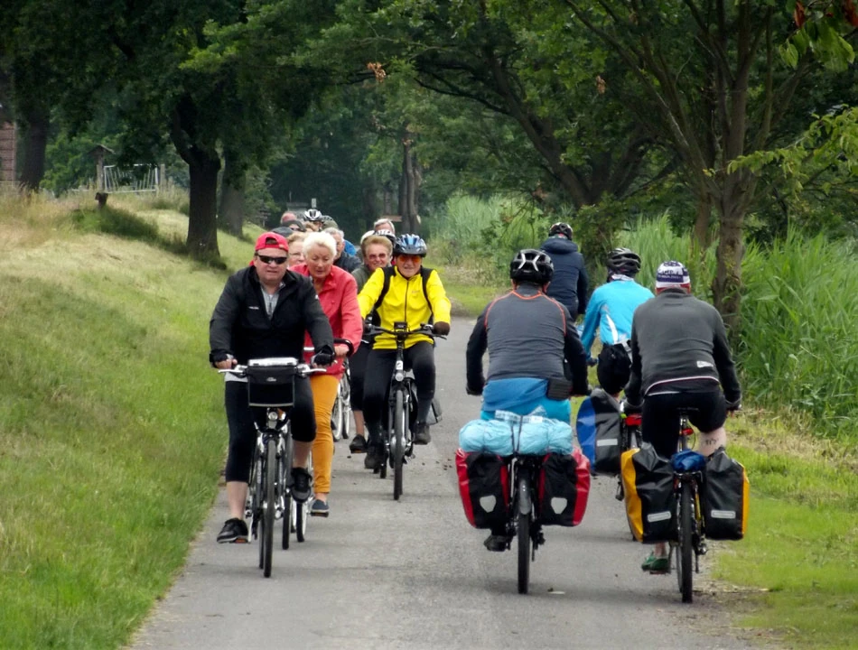 Mijamy kolejnych rowerzystów, znowu trochę od nas starszych, tym razem na trójkołowcach.