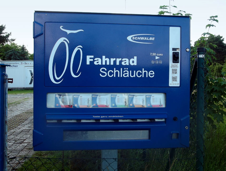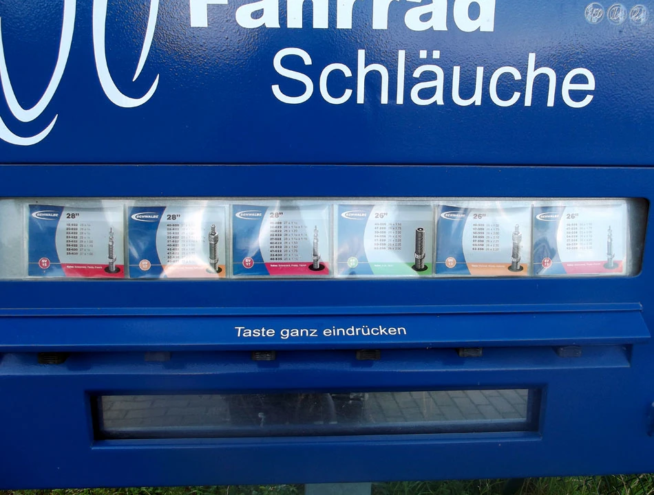 Gdzieś przy drodze znajdujemy kolejny dowód na jakość rowerowej infrastruktury. Automat, w którym można kupić dętki różnych rozmiarów i z różnymi zaworami.