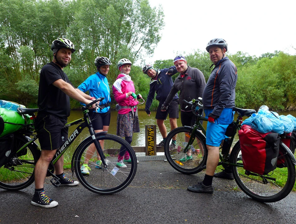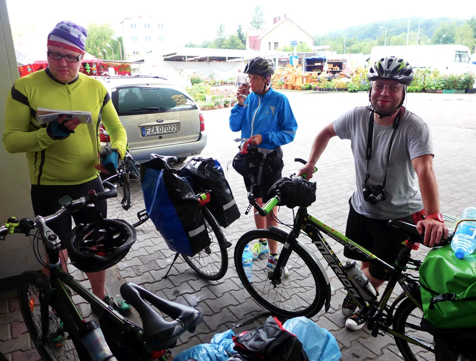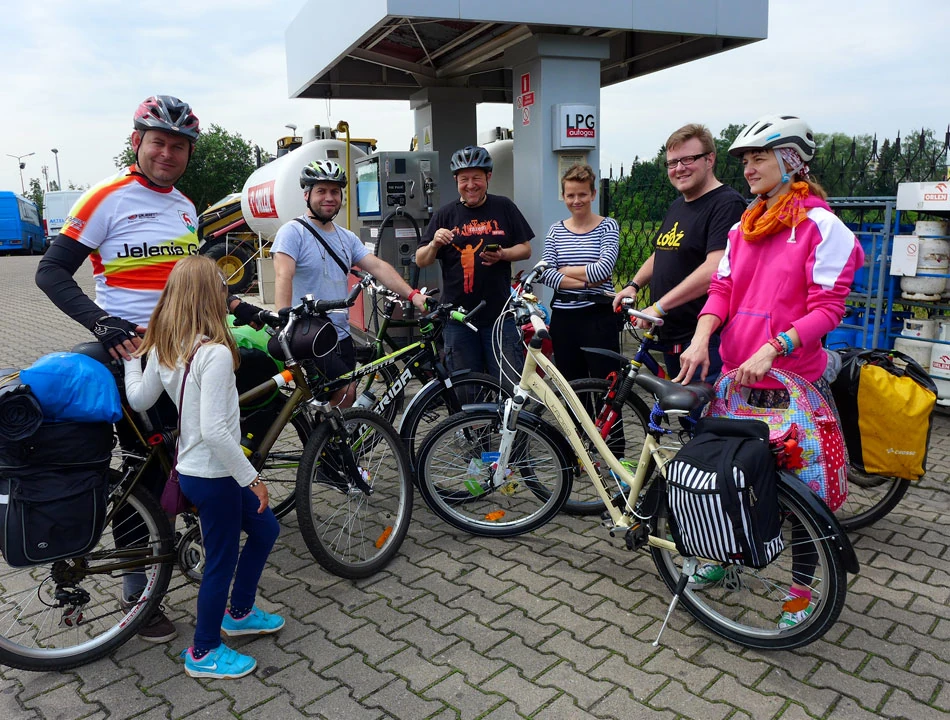 Dołącza do nas Marcin i pakujemy rowery. Podczas krótkiego przejazdu z dworca, okazuje się, że w Agnieszki rowerze tylna piasta daje duży opór. Szukamy czynnego warsztatu rowerowego najpierw w Jeleniej, a potem w Zgorzelcu, ale w sobotę nie jest to łatwe. Wreszcie w Zgorzelcu znajdujemy miłego pana, który ogląda rower Agnieszki. Okazuje się, że piasta „rozkręciła się” i działa trochę tylko piszcząc. Podobna przygoda zdarzyła się nam w drodze do Gdańska, wtedy jednak naprawa trwała dość długo. Przebrani za rowerzystów pozujemy do okolicznościowego zdjęcia: Agnieszka i Kowlak jechali z nami na Pomorze i do Białegostoku, Marcin i Marta jadą z nami w tak długą drogę po raz pierwszy, no i my: Marcin i Piotrek — autorzy zamieszania. Żegna nas Zosia, córka Marcina.