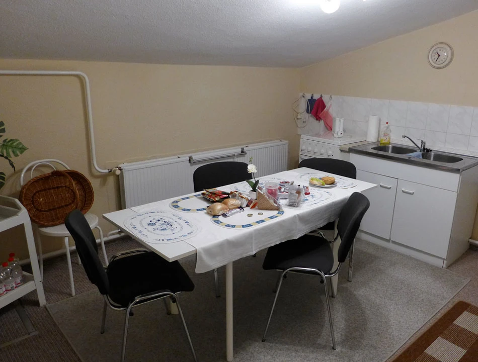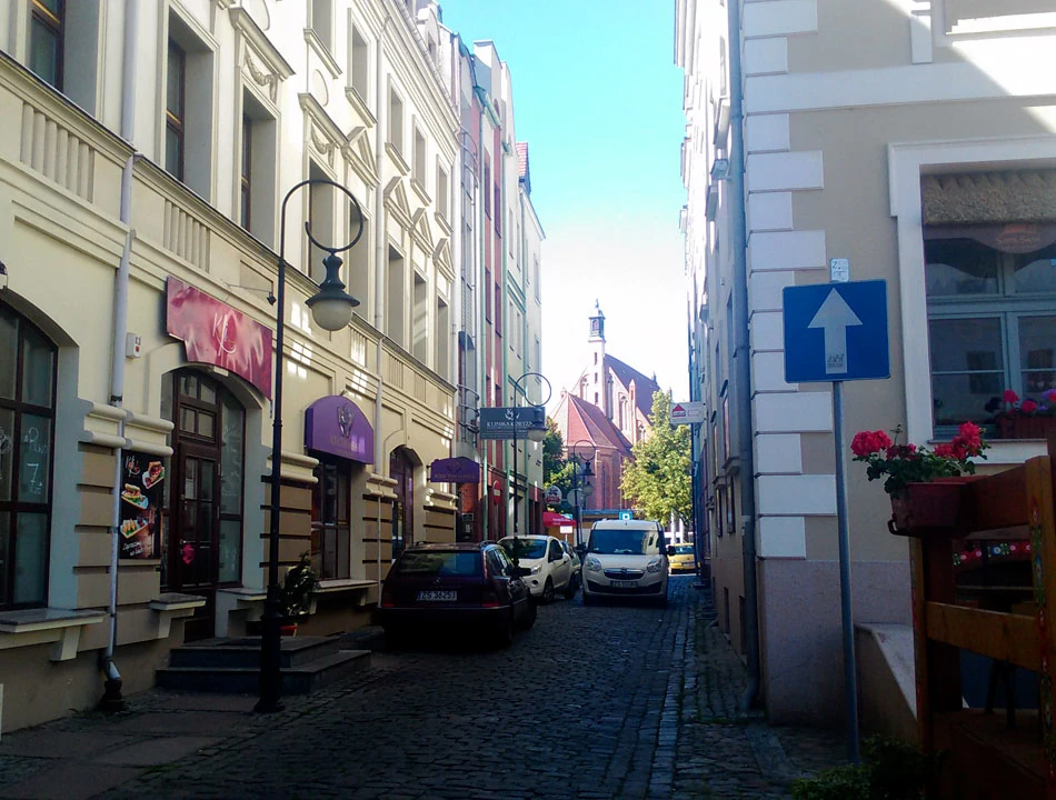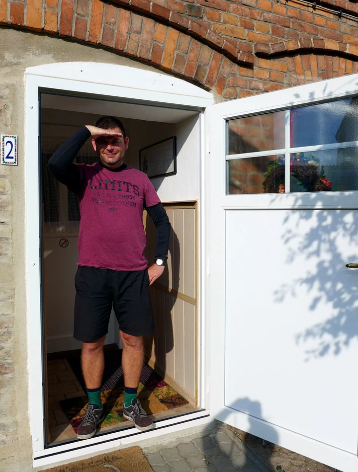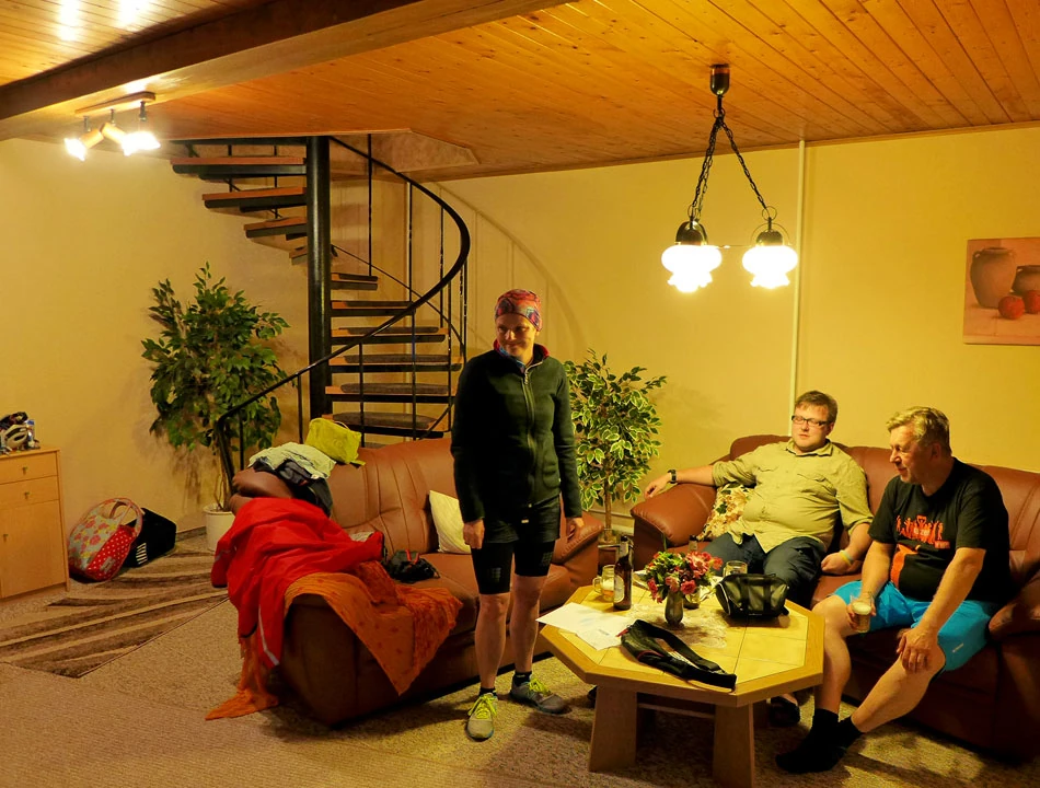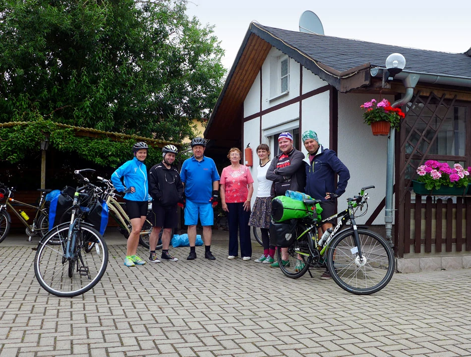 Po około godzinie poszukiwań znajdujemy na obrzeżach Forst ulicę Kwiatową, po ichniemu Blumenstraße; jest już dobrze po dwudziestej pierwszej i zdążyło się ściemnić. Dzwonimy do małego domku z ogródkiem. Cisza, po chwili wyłania się starszy pan. Przez płot krzyczymy, że nocleg i sześć osób, ale my znamy tylko kilka słów po niemiecku, a pan dla odmiany zna wiele słów, ale także po niemiecku. Wreszcie dogadujemy się na migi. Pan wsiada na rower (a jak!), a potem prowadzi nas na miejsce noclegu. A tam samodzielny domek z dwoma oddzielnymi mieszkankami. W każdym kuchnia i łazienka. W jednym mieszkaniu salon i sypialnia na piętrze. Wyciągamy z sakw resztki zapasów jeszcze z Polski i robimy kolację.