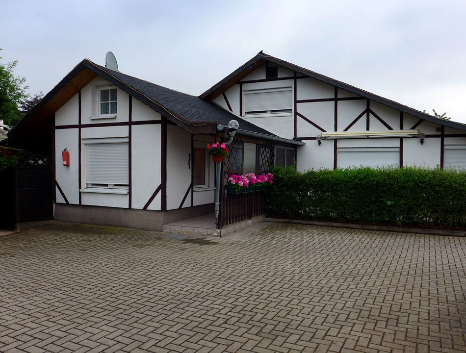 We Frankfurcie także szukamy noclegu podążając za rekomendacjami Bett und bike. Jednak nie znajdujemy niczego wolnego. W jednym z miejsc na obrzeżach miasta, pan wychyla się z okna i machając ręką pokazuje, że wolne kwatery są gdzieś tam, przed nami. I rzeczywiście, znajdujemy domki z informacjami o kwaterach. Już w drugim z kolei znajdujemy nocleg, choć nie ma on akredytacji Bett und bike. I tym razem są to dwa oddzielne pokoje, mamy też dla siebie do dyspozycji łazienkę i kuchnię. Miły właściciel pytający ciągle alles clar? pokazuje nam pokoje, otwiera garaż, abyśmy mogli schować rowery i wyjaśnia jak dojechać tramwajem do pobliskiej pizzerii. Korzystamy z informacji i jedziemy na kolację. Wracamy już na piechotę, bo tramwaje przestały kursować. Tym razem nocleg jest bez śniadania, lecz atmosfera tak samo miła jak poprzedniej nocy. Rano pakujemy się, robimy fotkę i jedziemy dalej. Nocleg kosztował nas 22 € od osoby.