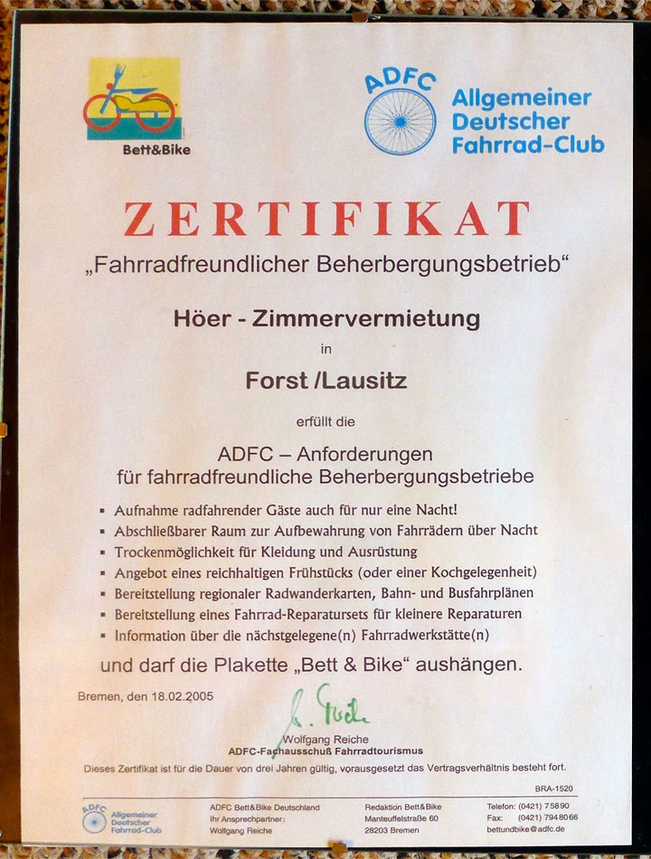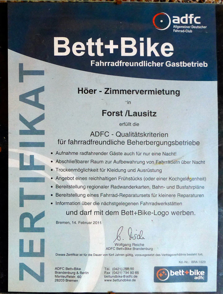 Planując noclegi korzystaliśmy z rekomendowanych przez Bett und bike miejsc. To organizacja na stronie której można znaleźć polecane dla rowerzystów miejsca noclegowe. Od eleganckich hoteli po tanie bed and breakfast. Właściciele takich miejsc są przygotowani na klientów z rowerami: mają miejsca na przechowanie rowerów, często są wyposażeni w narzędzia do drobnych napraw i zwykle jest miejsce na wysuszenie mokrej odzieży.