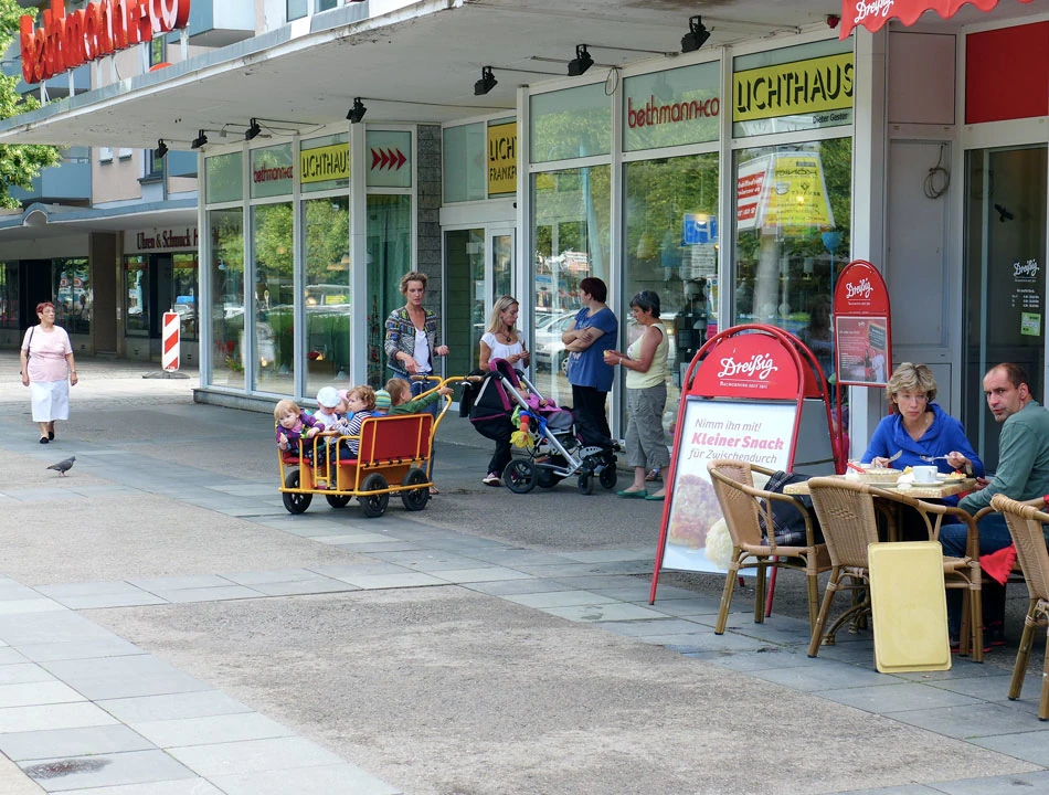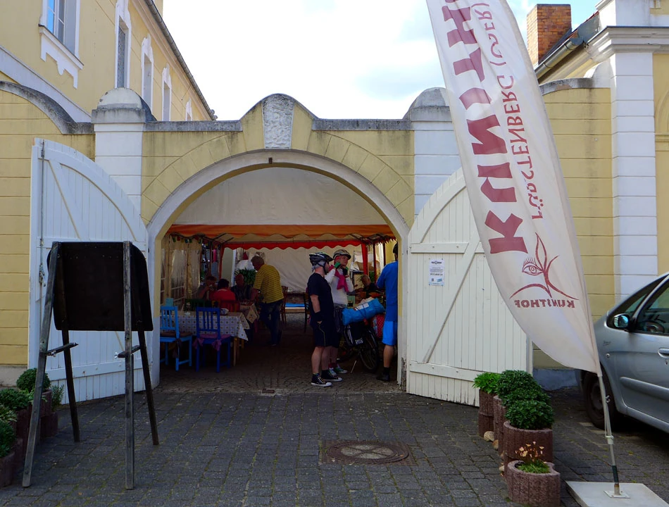 Zasiadamy w kawiarni w pobliżu rynku, a może bardziej targu. W restauracji trwa biesiada z muzyką na żywo i śpiewami. Na sali same starsze osoby bawiące się szampańsko i śpiewające chóralnie. My zajmujemy miejsca na zewnątrz. Tym razem kawka i ciacho. Zaczynamy żegnać się z Kowlakiem, który musi być następnego dnia w Warszawie. Kowlak ma do stacji we Frankfurcie około 30 kilometrów. Zdąża na pociąg i potem napisze, że zrobił „życiówkę”.