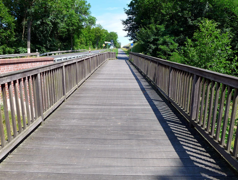 Droga znowu wiedzie szczytem nasypu, ale też obok. Na nasypie droga jest raczej jednoosobowa, obok nasypu wariant bardziej towarzyski. Jednak monotonia drogi dla niektórych jest nużąca.