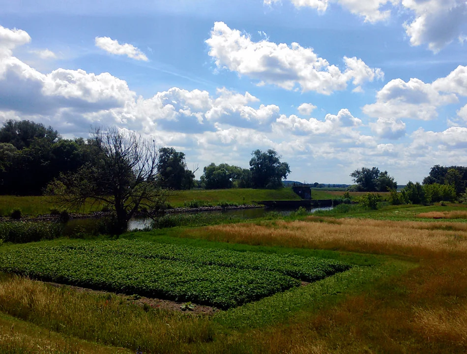 Pedałujemy z biegiem leniwej Odry i po raz pierwszy napotykamy uprawy warzyw nad samą rzeką.
