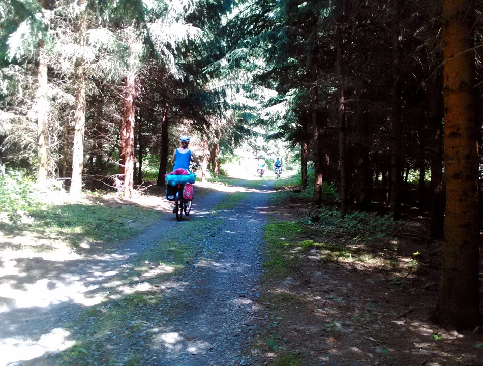 Droga z wolna zaczyna się wspinać. Te różnice wzniesień szczególnie odczuwają Marta i Piotrek. Wreszcie wdrapujemy się na najwyższe wzniesienie i jazda na dół. Zjazd serpentynami odbywa się z prędkością prawie 50 kilometrów na godzinę. Jeszcze chwila i docieramy do cywilizacji.