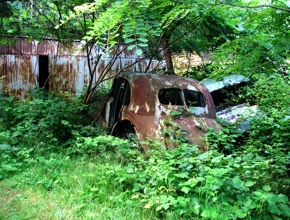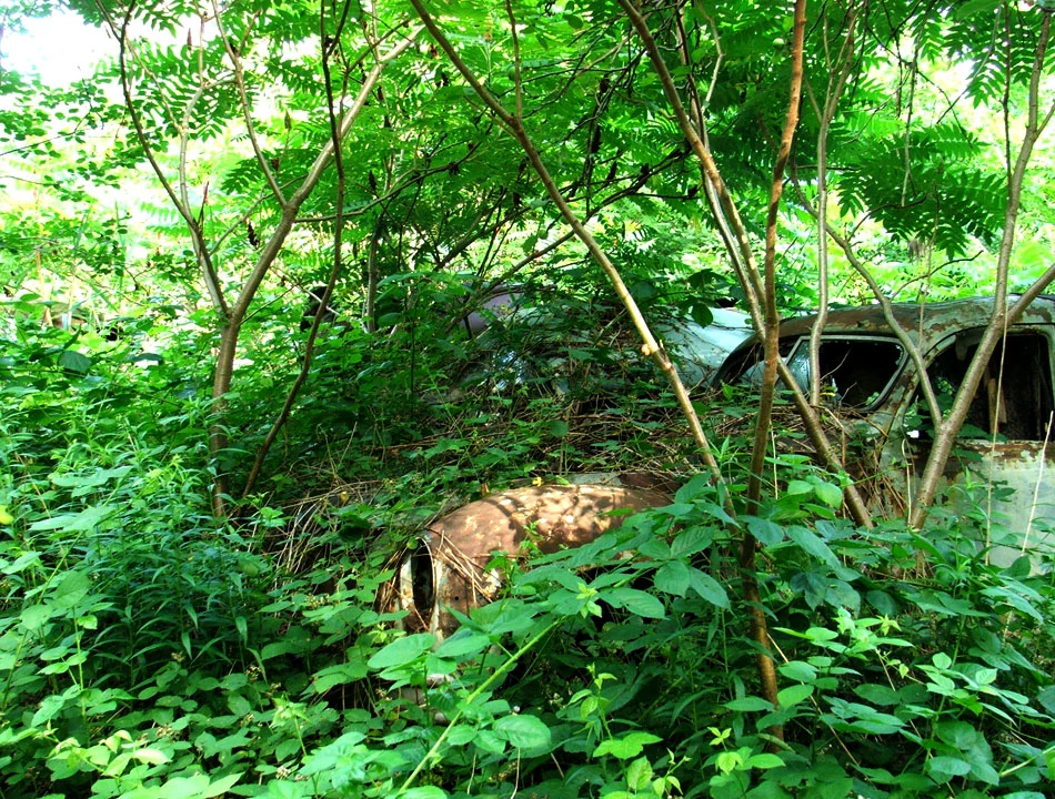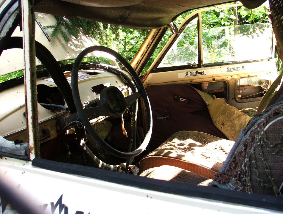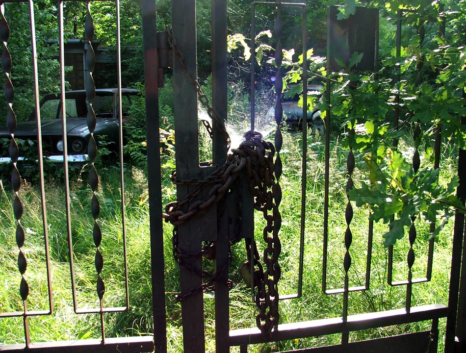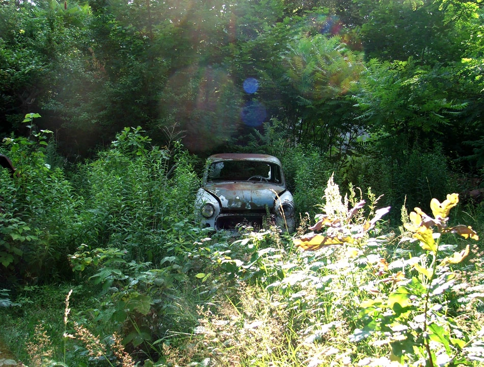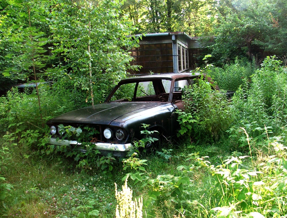 W Grodzisku czeka na nas Małgosia, która ma być dzisiaj naszą przewodniczką, nie pierwszy raz zresztą. Jest szczerze zadziwiona, gdy mówimy jej o cmentarzysku samochodów. — Jeśli ja nie wiem o czymś takim, to w Grodzisku na pewno niczego takiego nie ma — upiera się. Coś jest może na rzeczy, jednak już we trójkę szukamy tego tajemniczego miejsca. Na znalezionej stronie internetowej czytamy o zapomnianej działce w lesie, o jednej z największych i najdroższych prywatnych kolekcji samochodów w Polsce i na świecie. Brzmi arcyciekawie. Od Królewskiej jedziemy ulicą Na Laski, Piaskową, Podgórną, Myśliwską, do Orląt. I tu rzeczywiście, pod numerem bodajże 11, jest posesja. Trochę może i w lesie, ale w zasadzie po prostu zarośnięta. Zdewastowany teren, dom z powybijanymi szybami i wyrwanymi drzwiami, dziurawe ogrodzenie. Widać wszystkie przejawy opuszczenia. Są też samochody, a zasadzie wraki samochodów. Skorupy, z których wyrwano wszystko, co dało się sprzedać lub zezłomować. Smutny obraz i tylko uruchamiając wyobraźnię i wiedzę samochodową, można dostrzec w tym miejscu jakiś urok.