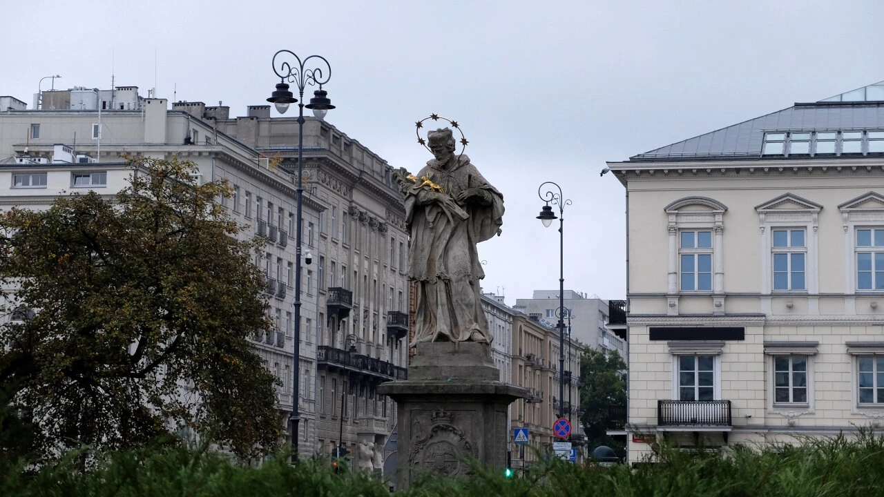 My zaczynamy z Placu Trzech Krzyży, tu stoi nasz pierwszy dzisiaj nepomuk.
