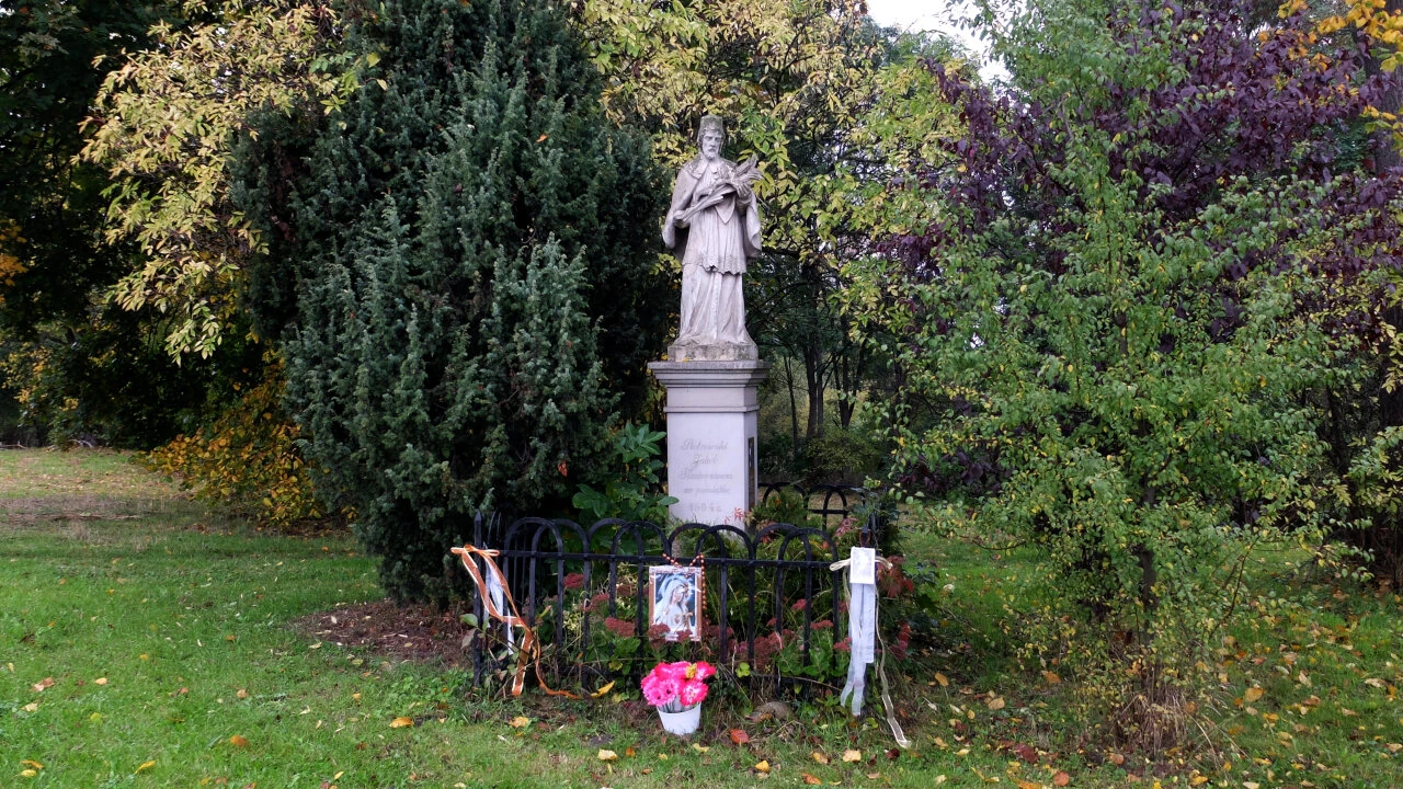 Jedziemy Ujazdowskimi do Belwederskiej i w dół do Sobieskiego. Skręcamy w Sikorskiego i dalej popylamy Doliną Służewiecką. Przy skrzyżowaniu z Nowoursynowską jest nasz kolejny przystanek. To kopia rzeźby (oryginał stoi w klasztorze Dominikanów) ufundowanej w 1863 roku. Jan Nepomucen przedstawiony został z brodą i wąsami, a na sutannie na nałożoną komżę (symbol kapłaństwa), wykończoną koronką. Trzyma w dłoniach krzyż i palmę, będącą symbolem męczeńskiej śmierci. Zwykle jeszcze ma pięć gwiazd symbolizujących pięć cnót męczeńskich – ten ursynowski gdzieś gwiazdy zapodział.