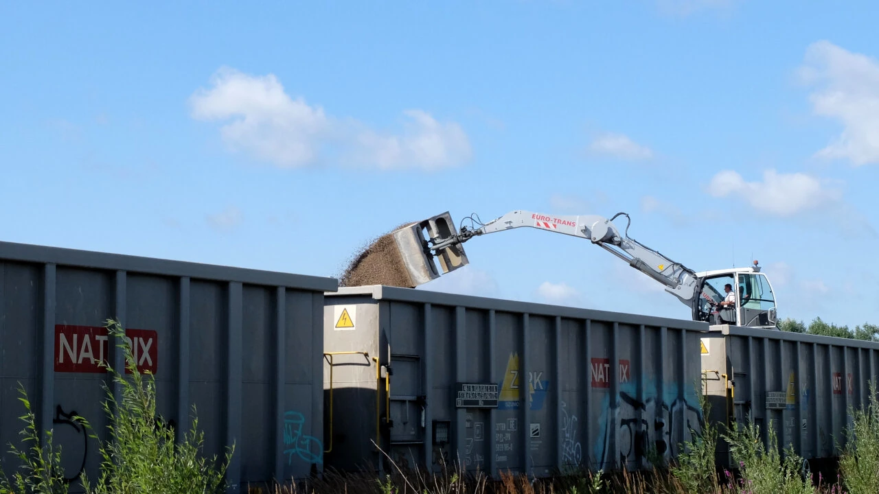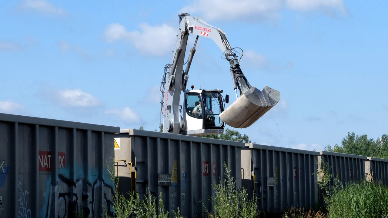 Znowu wracamy do wijącej się Gniewkowskiej. A tu mimo niedzieli praca wre. Choć wygląda to bardziej jak taniec. Trzy wielkie koparki przeładunkowe wyciągają z wagonów kruszywo i wyrzucają na plac.