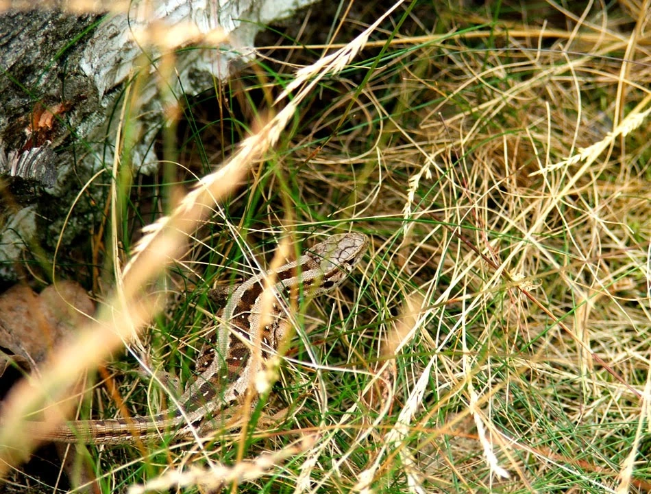Na pniu obok kapliczki w promieniach słonecznych wygrzewa się samica jaszczurki Zwinki.