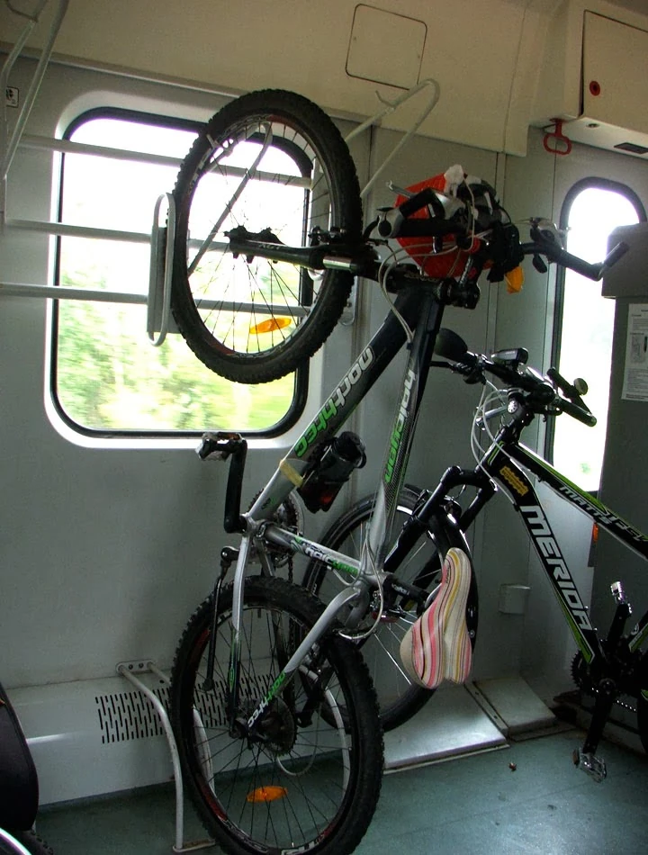 Z Warszawy do Sochaczewa jedziemy pociągiem kolei mazowieckich. Podróż koleją z rowerem to zawsze dla nas przygoda sama w sobie. O dziwo pociąg ma specjalny wagon do przewozu rowerów. Jednak stojaki na rowery to wieszaki, na których rower wisi na przednim kole. My z nich nigdy nie korzystamy, ale zawsze znajdzie się ktoś, kto próbuje wykonać karkołomną czynność wieszania, przy okazji obcierając sobie obręcz przedniego koła i brudząc wszystko wokół. I pomyśleć, że na przykład w Danii wagon do przewozu rowerów to po prostu wagon z dużą ilością wolnej podłogi.