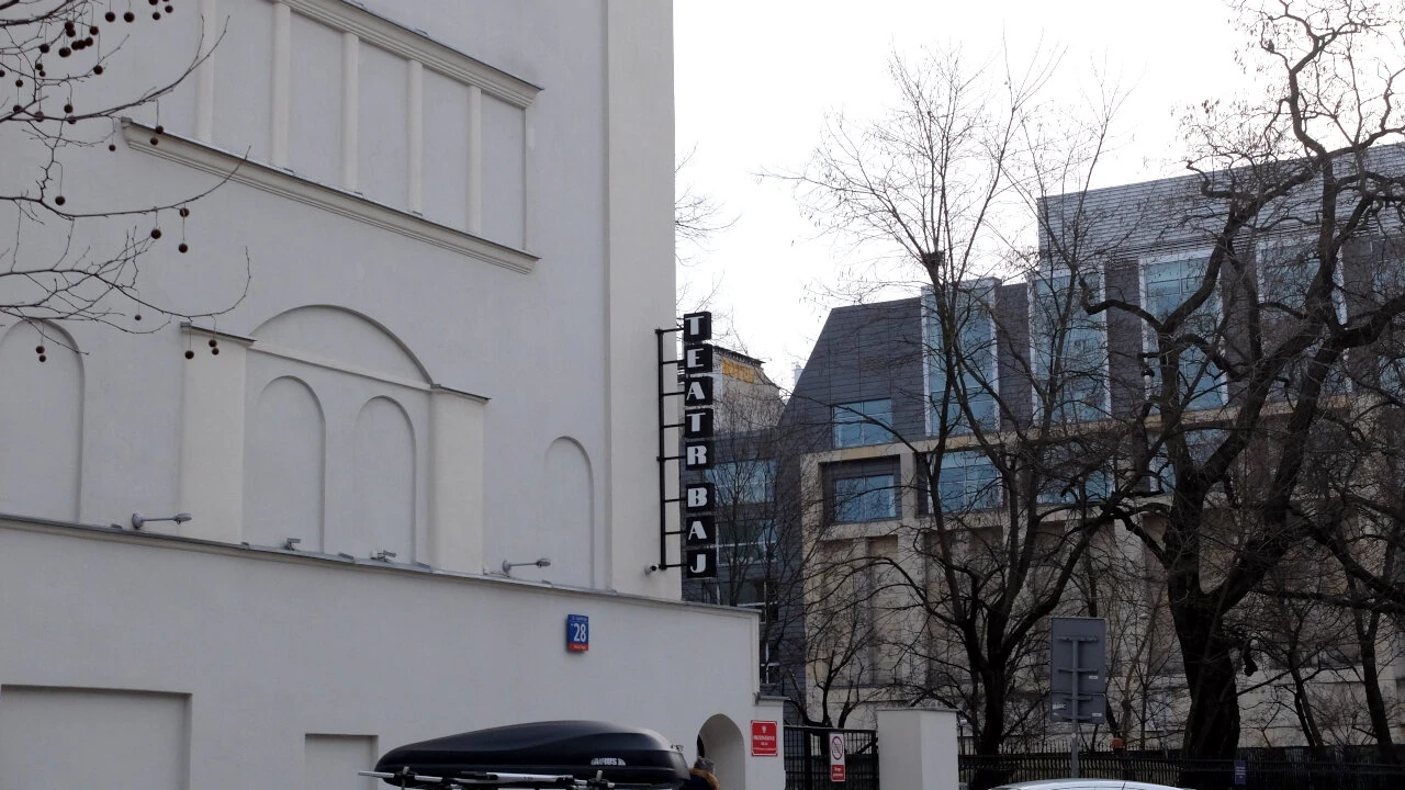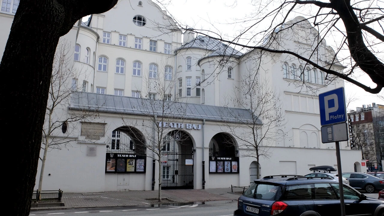 Wsiadamy zatem na rowery i pedałujemy kawałeczek na Jagiellońską, do Teatru Baj. Teraz jest pięknie odremontowany, do niedawna był burą bryłą. Jaki to jest wielki budynek. Kiedyś to wychowawcza instytucja imienia Michała Bergsona. Od ulicy była ochronka dla dzieci, świetlica z jadalnią i salą zabaw, oraz szkoła dla 550 dzieci.