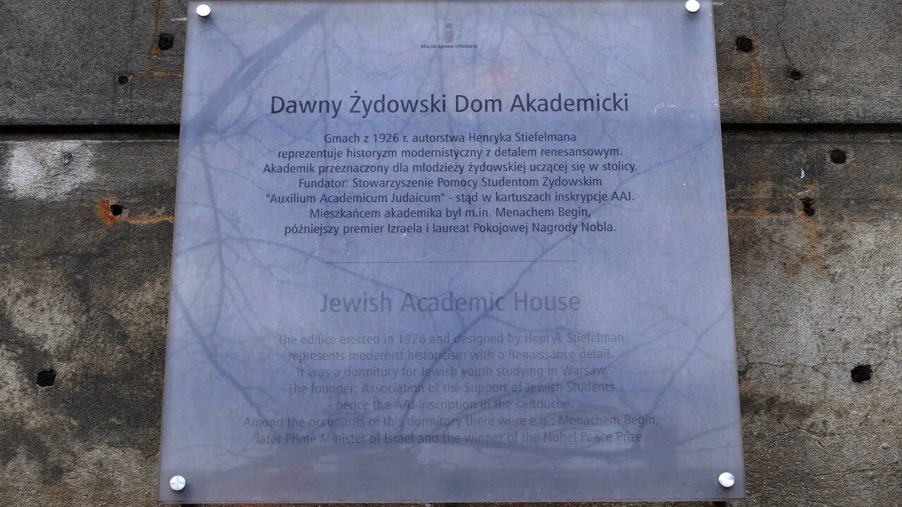 Budynek pełniący funkcję bursy dla żydowskich studentów powstał z funduszy Stowarzyszenia Pomocy Studentom Żydowskim, a parcelę na ten cel ofiarowali żydowscy kupcy i przemysłowcy Pragi. Gmach mieścił 147 pokoi mieszkalnych z umywalkami, natryskami i toaletami. Znajdowały się w nim także między innymi sala gimnastyczna, czytelnia, biblioteka, pokoje do gier rozrywkowych, pokoje do przyjmowania odwiedzin, izba chorych z gabinetem lekarskim, łazienki, fryzjernia, ciemnia fotograficzna, sala odczytowa. W domu mieszkało około 300 studentów, wśród nich Menachem Begin, student Wydziału Prawa Uniwersytetu Warszawskiego, w latach 1977–1983 premier Izraela. (Wikipedia)