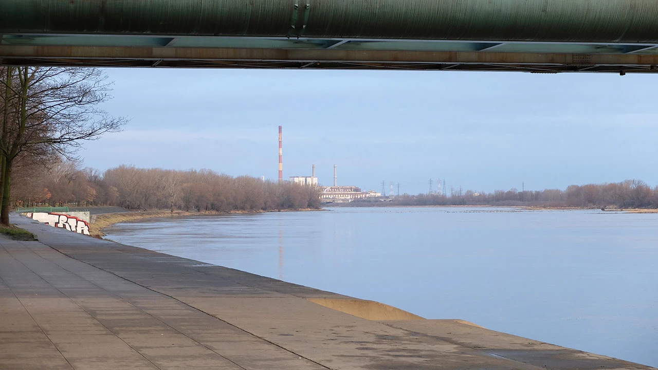 Jedziemy bulwarem w górę Wisły. Doskonale widać komin elektrociepłowni Żerań (nie tak sławny, jak ten siekierkowski, nie mniej też potężny).
