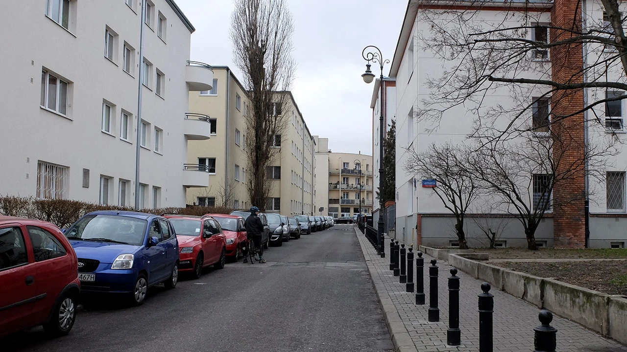Piotrek chce jeszcze zahaczyć o Bielany, przeskakujemy więc nad Trasą Toruńską, przecinamy Park Olszyna i Broniewskiego jedziemy w stronę Jarzębskiego. Broniewskiego poruszamy się po „sławnej” drodze dla rowerów wykonanej z płyt chodnikowych – miejska legenda mówi, że taka nawierzchnia jest po to, by łatwo było ją rozebrać, gdyby nie działały podziemne instalacje prowadzące do pobliskiego komisariatu policji. Jarzębskiego przecinamy Żeromskiego i skręcamy w Schroegera. Chwilę kręcimy się po Placu Konfederacji, centralnym miejscu PPS-owskiego osiedla Zdobycz Robotnicza.