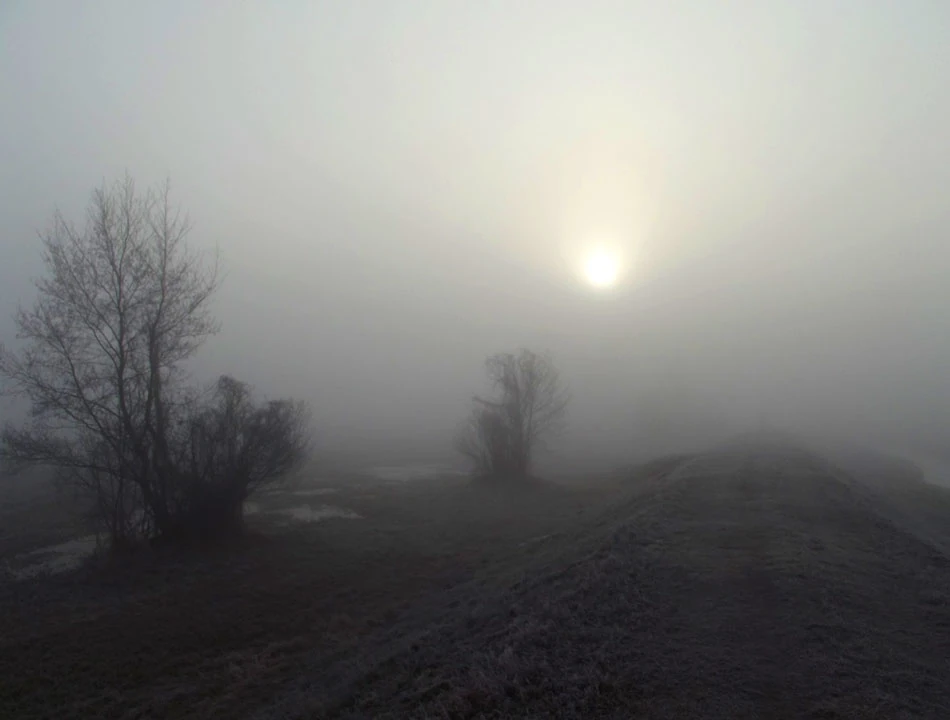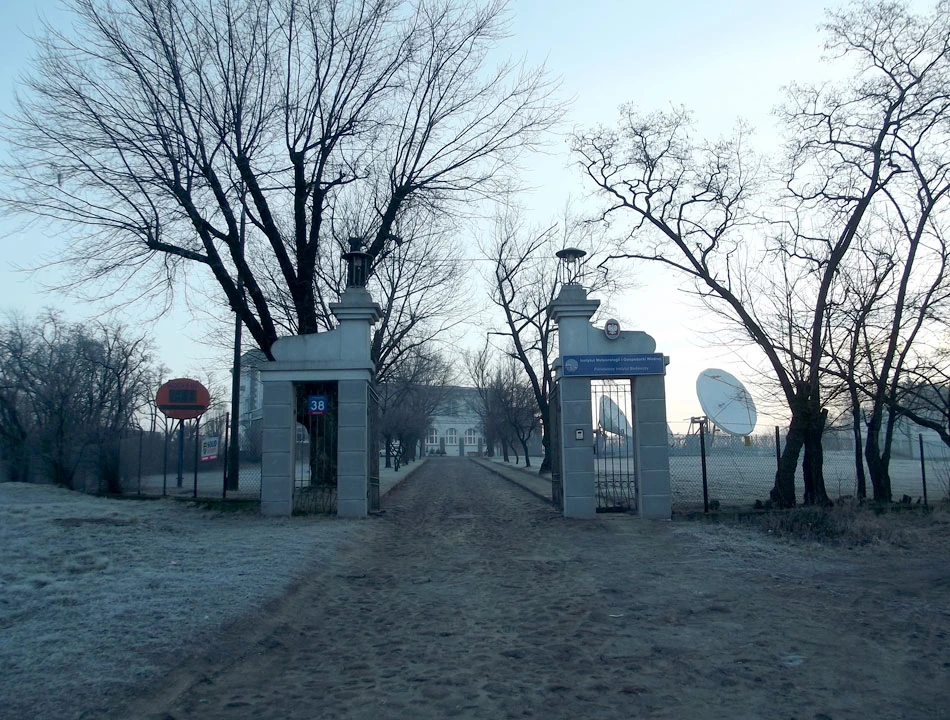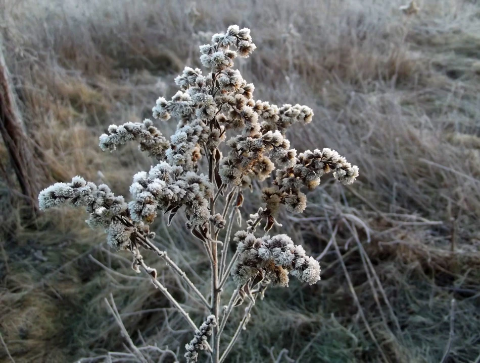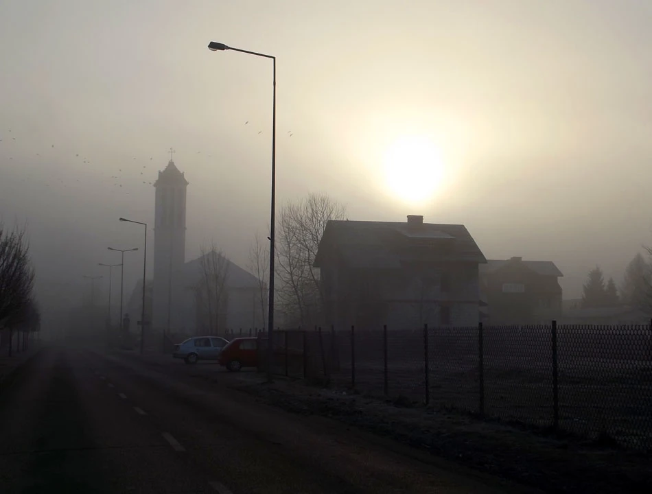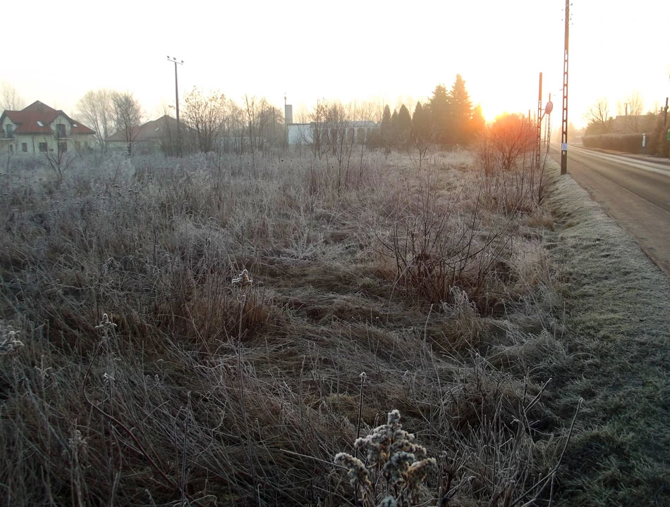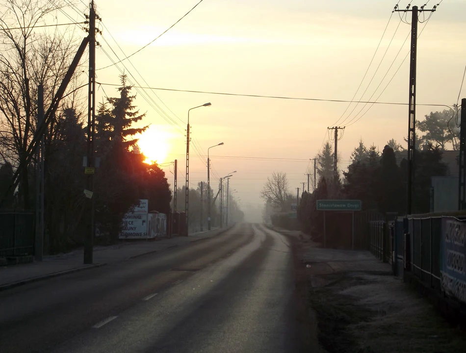 Stanisławów Drugi wita nas czerwonym niebem i mleczną mgłą. A wszystko wkoło pobielone jest od szronu; kwiaty i trawy nabrały dostojnej siwizny.