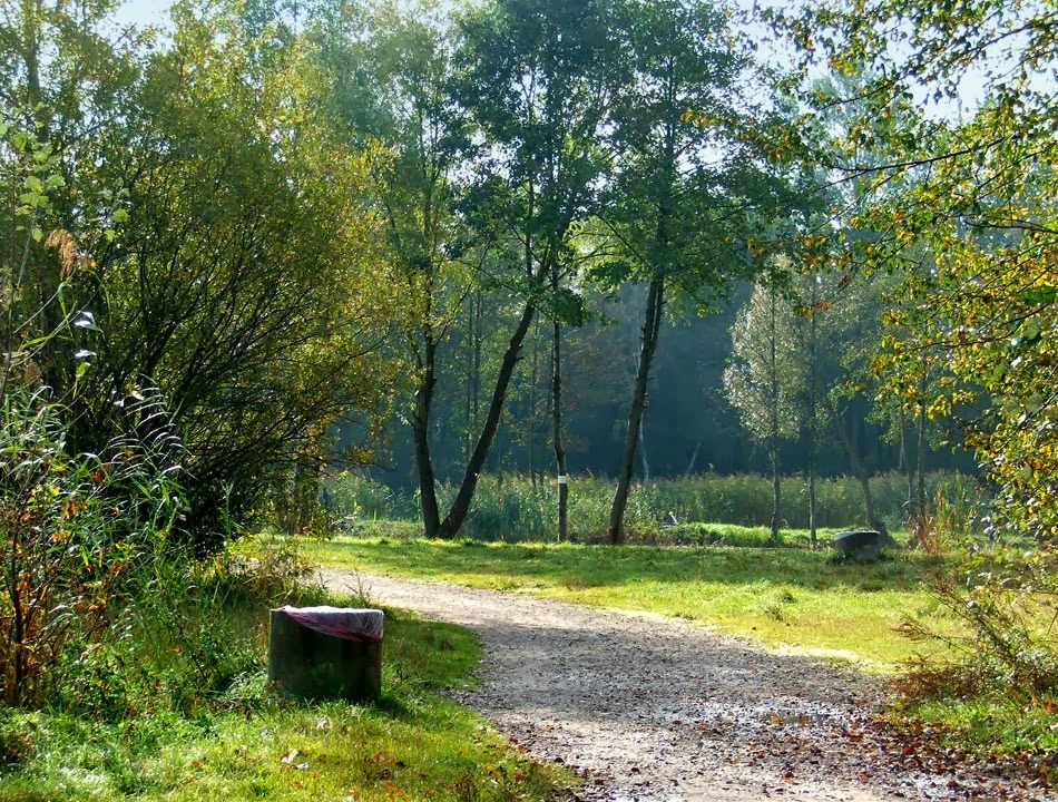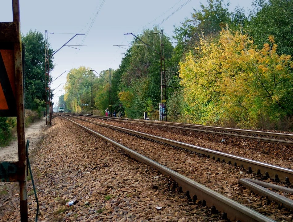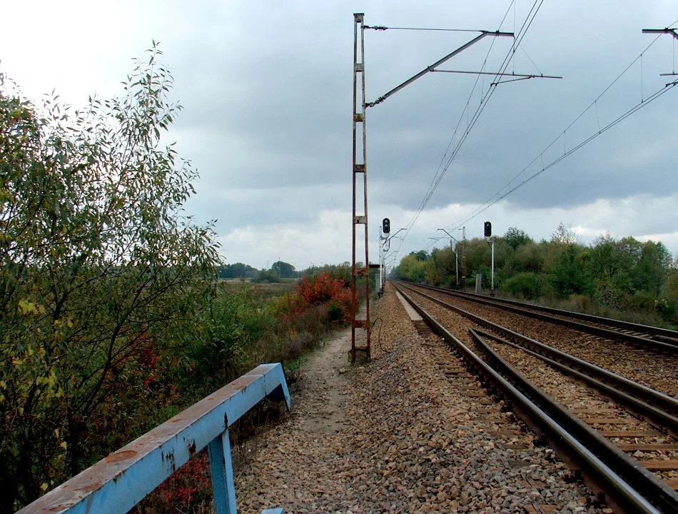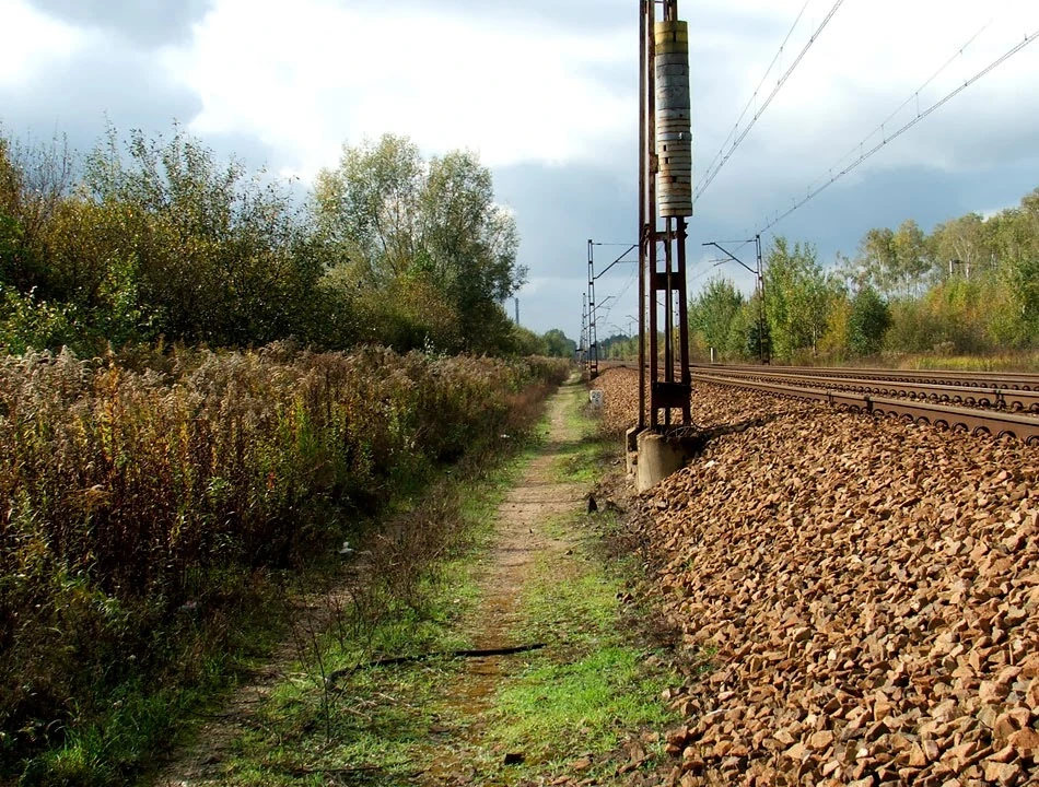 Jakiś czas udaje się nam jeszcze jechać drogą wzdłuż torów, a potem za stacją Wołomin Słoneczna zatrzymuje nas rzeczka. Wchodzimy na mostek i odkrywamy wydeptaną dróżkę przy samych torach. Spotykamy kilka osób, które tak jak my spacerują blisko torów. Najwyraźniej to lokalna uczęszczana droga. Udaje się nam tak dojechać do Zagościńca. Potem dajemy się skusić bitej drodze. Po jakimś czasie droga zamienia się w dróżkę, następnie w łąkę, potem przechodzi w wysoką trawę, by wreszcie stać się gąszczem splątanych krzaków. Już od jakiegoś czasu pchamy rowery, potem je niesiemy. Docieramy do torów i oczom naszym ukazuje się wydeptana wzdłuż nich ścieżka, którą tak lekkomyślnie porzuciliśmy kilka kilometrów wcześniej.