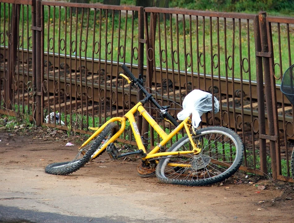 Na peronie leżą zwłoki roweru; muszą tu leżeć już dosyć długo.