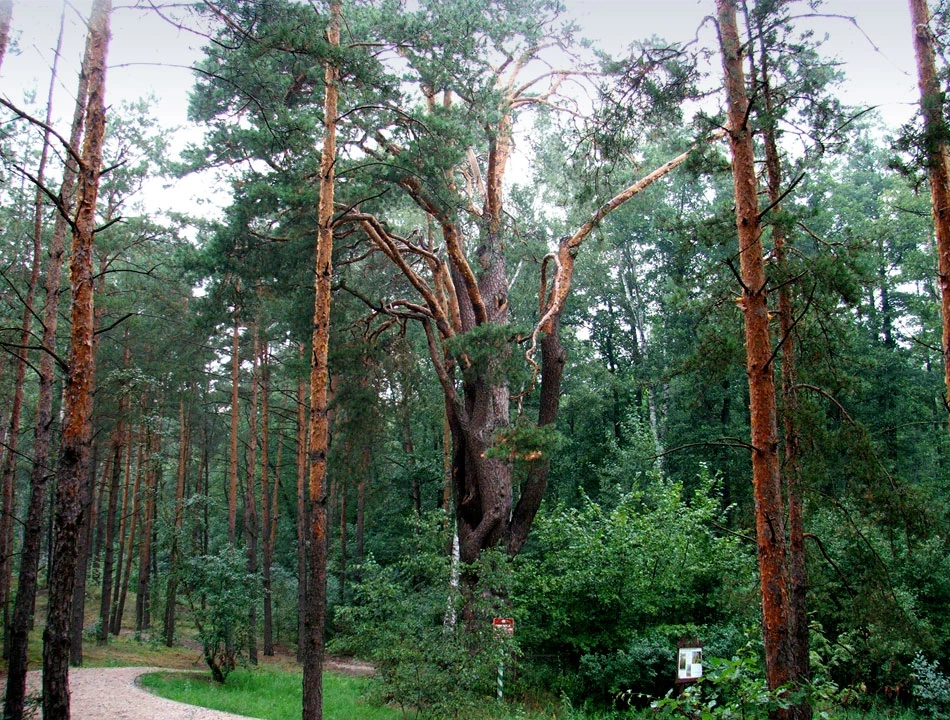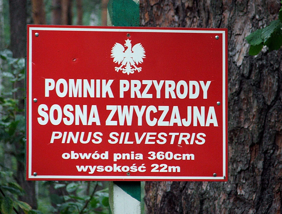 Potem przeskakujemy drogę numer 50 na Kołbiel i posuwamy się ulicami Osiedlową i Wiejską. Zaraz za Tomaszowem natykamy się na rezerwat najstarszej sosny w Polsce. Nie wiedzieliśmy, że poczciwe sosny mogą być tak duże i tak wiekowe. Drzewo ma — bagatela — ponad 360 lat.