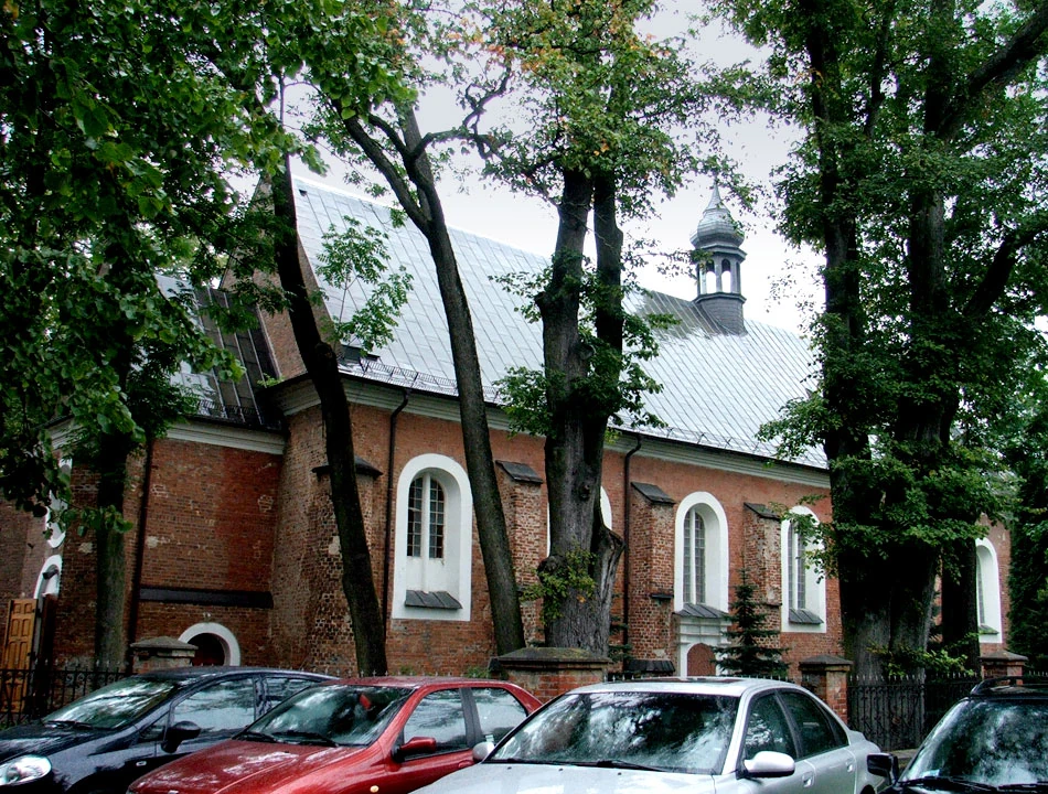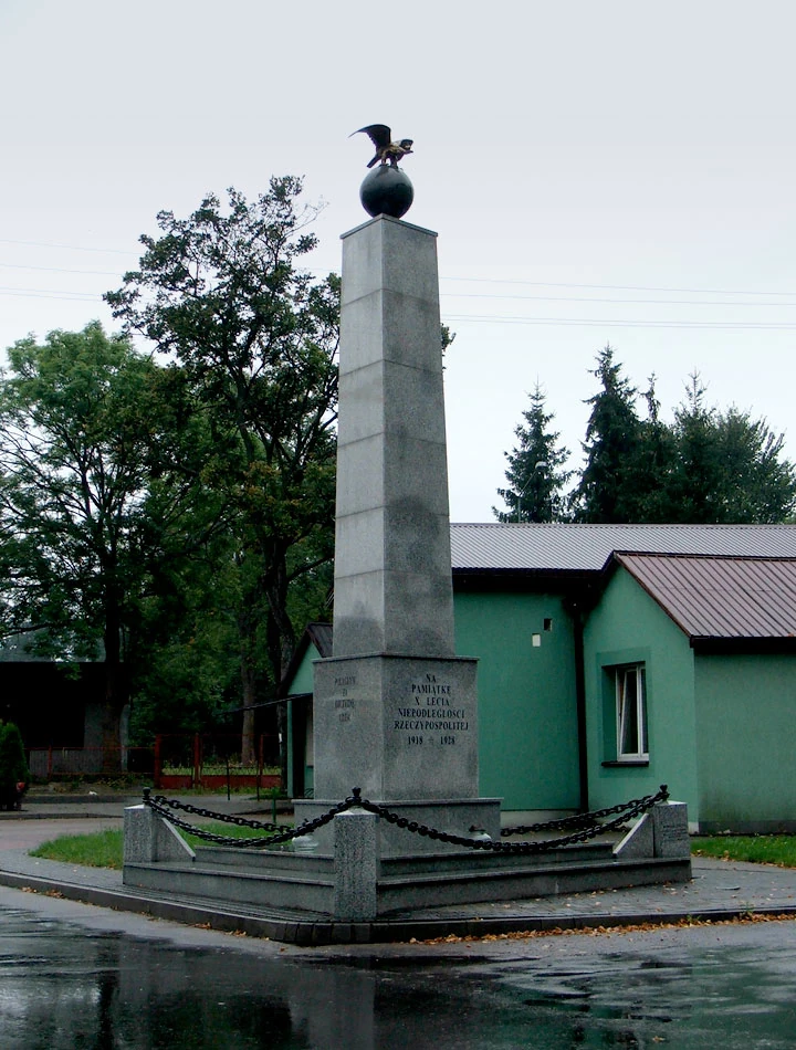 W pobliżu kościoła widać obelisk upamiętniający odrodzenie Polski po I wojnie światowej.