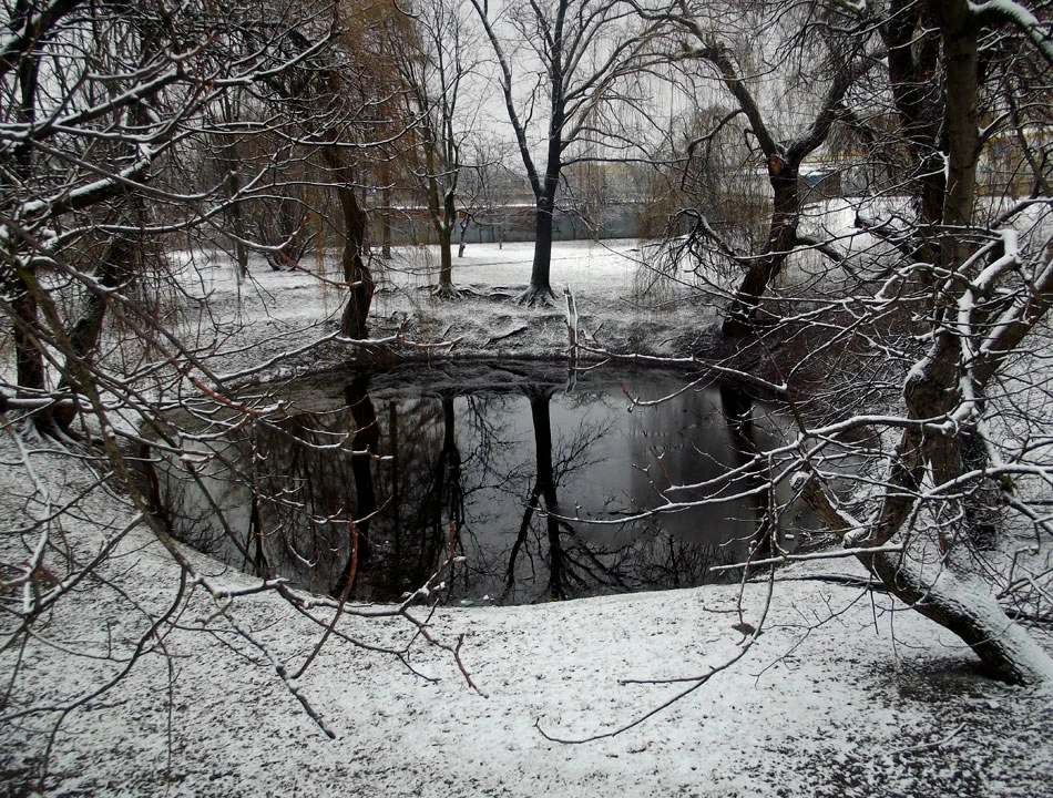 My, niezrażeni, staramy się przebić przez budowę i przy okazji odkrywamy kameralny staw schowany poniżej Włościańskiej. Dziwna przyrodnicza enklawa w środku węzła drogowego.