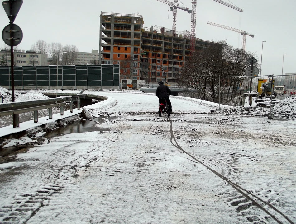 Zbaraską, Stanisława Augusta i Aleją Wedla dojeżdżamy w okolice Zielenieckiej. I dalej trochę nie wiadomo dokąd, to może Jagiellońską do Gdańskiego? I na drugą stronę Wisły? I tak robimy. A dalej, całkiem nową jeszcze drogą dla rowerów, jedziemy do Międzyparkowej, by przeskoczyć w stronę Żoliborza Oficerskiego. Chcemy skorzystać ze skrótu, który wiedze od Międzyparkowej, pod Słomińskiego i wychodzi na ulicę Krajewskiego. Zaraz za torami tramwajowymi na Międzyparkowej przykra niespodzianka – ktoś zlikwidował kołowrotki chroniące przed wtargnięciem na tory; teraz stoją tu prozaiczne płotki. Na pewno łatwiejsze w utrzymaniu, ale pozbawione jakiegokolwiek uroku.