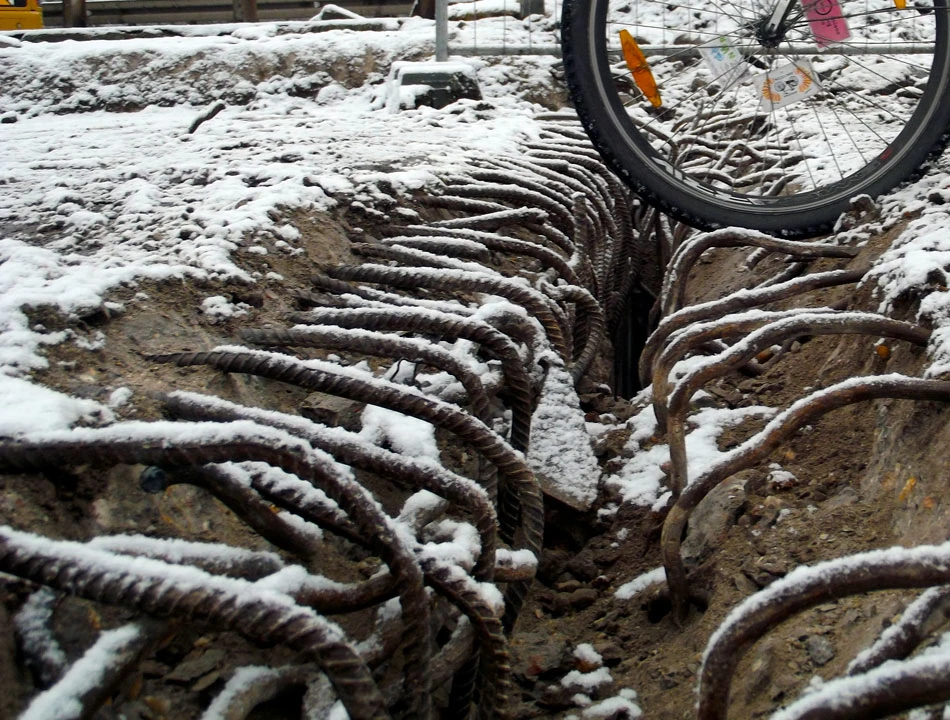Przebijamy się przez sam środek budowy. Pusto tu, my jedyni się tu zapuszczamy. Drogę urozmaicają rozpadliny wyglądające jak z kadrów filmów katastroficznych.