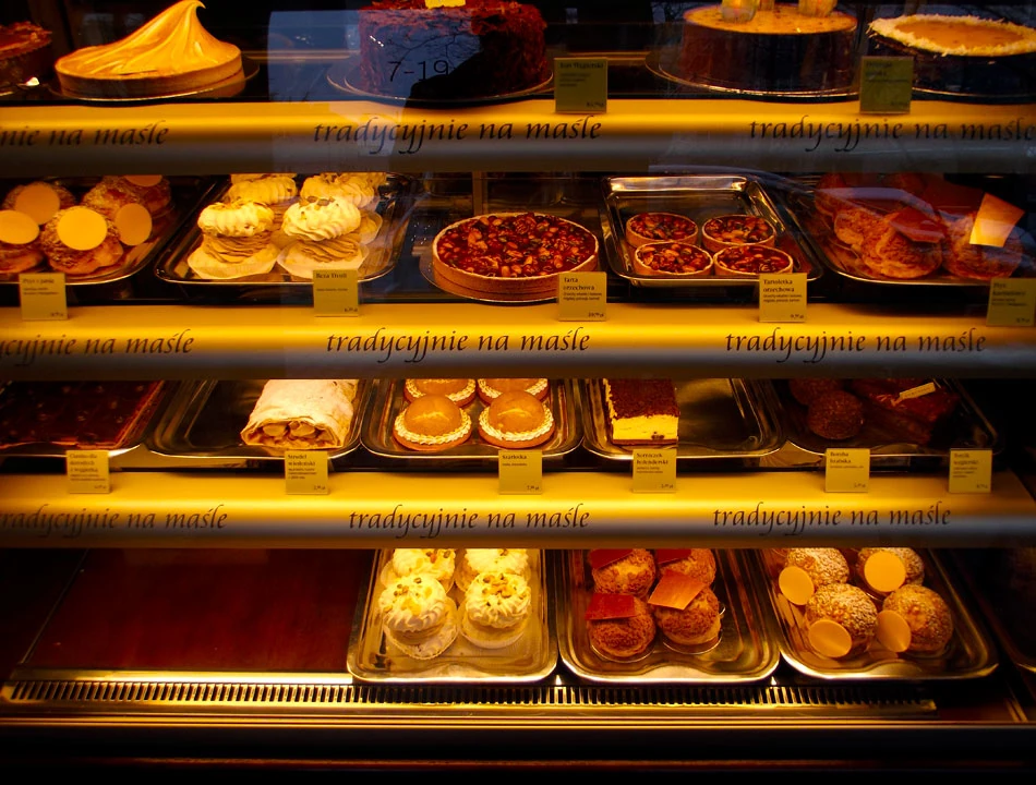 Staffa ruszamy w stronę Bielan. Gdzieś w okolicach Lisowskiej atakuje nas smakowita smuga zapachowa; wyraźnie pachnie ciastkarnią. Wokół same blokasy, chyba z lat pięćdziesiątych. Nie widać niczego przypominającego ciastkarnię. Kierując się węchem, znajdujemy pawilon z wejściem i napisem nie budzącym wątpliwości. Mimo wszystko z niedowierzaniem wchodzimy do środka. A w środku witrynka gwałtownie uruchamiająca nasze ślinianki.