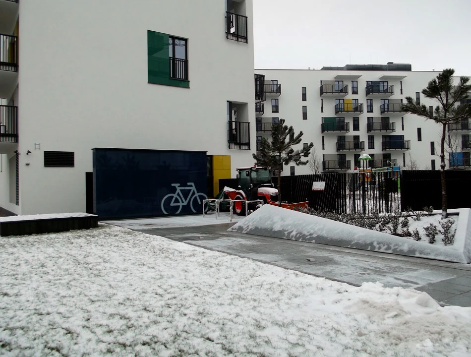 Architekci zadbali o stojaki dla rowerów, które powoli stają się oczywistym widokiem na nowo projektowanych osiedlach.