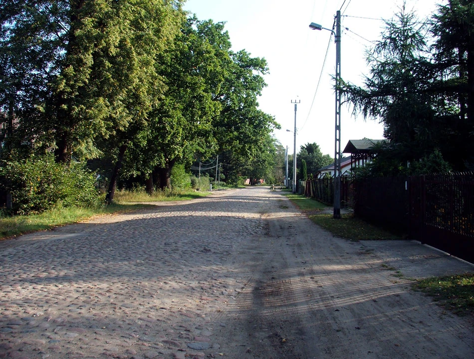 Sienkiewicza wjeżdżamy w Spacerową, która chwilę prowadzi przez las, a potem staje się ulicą z kocimi łbami pamiętającymi przedwojenne czasy.