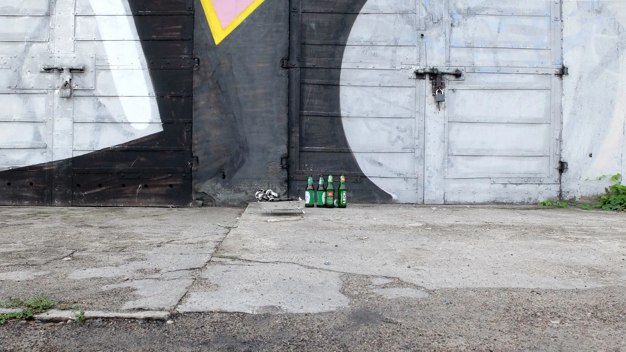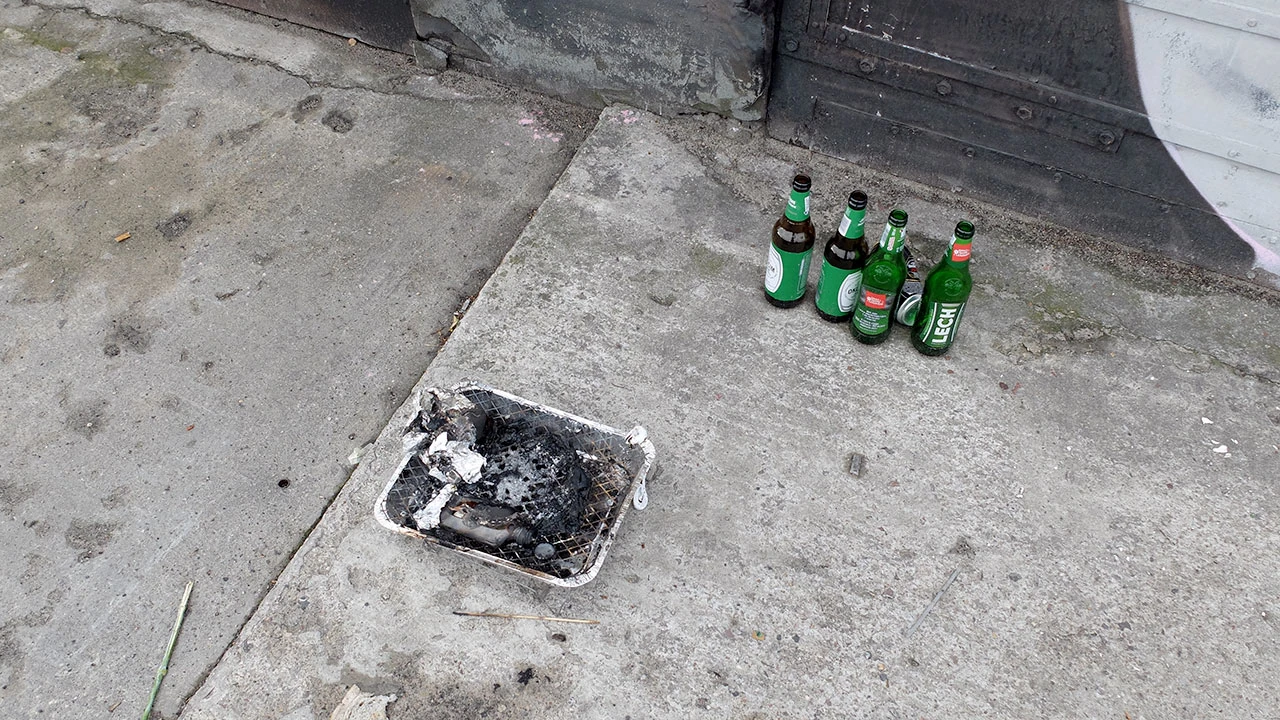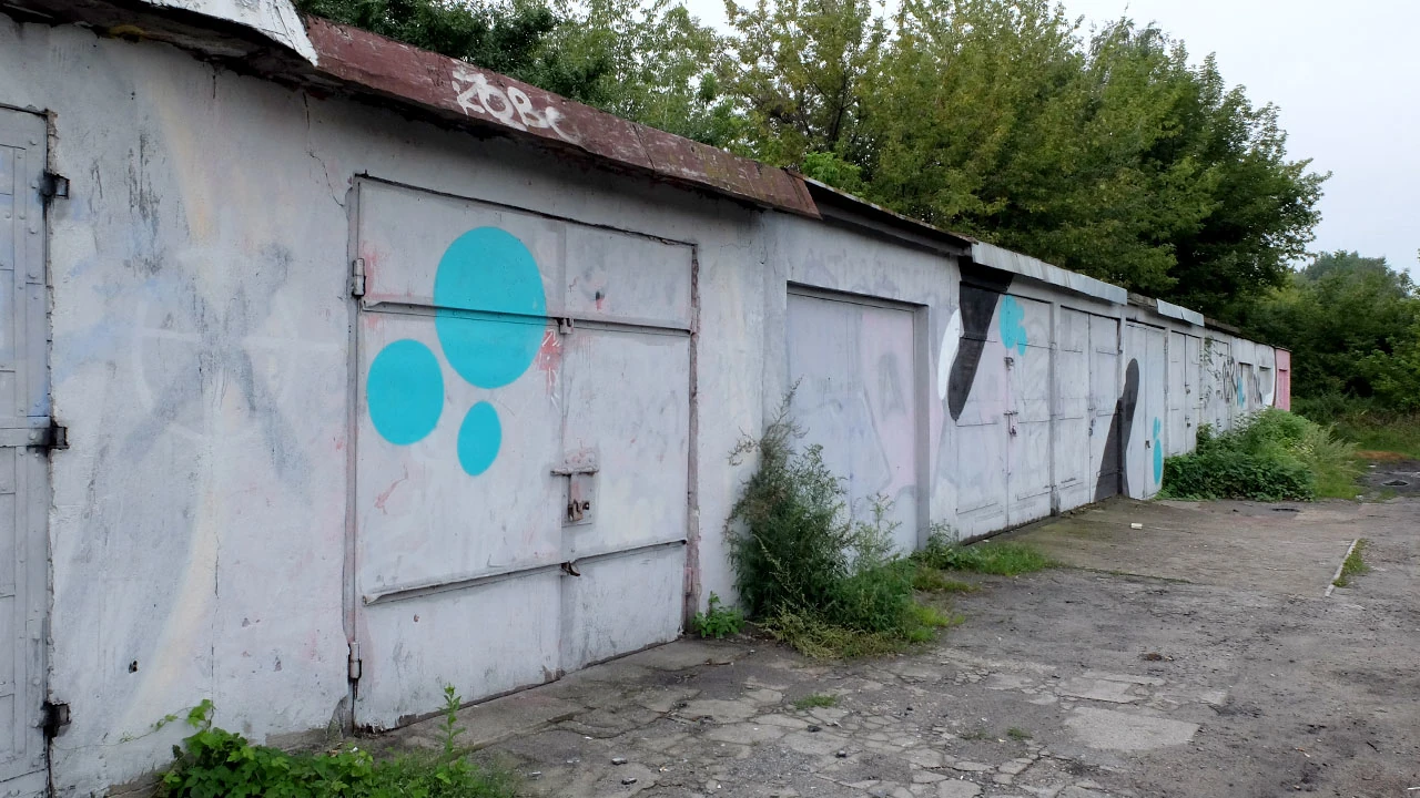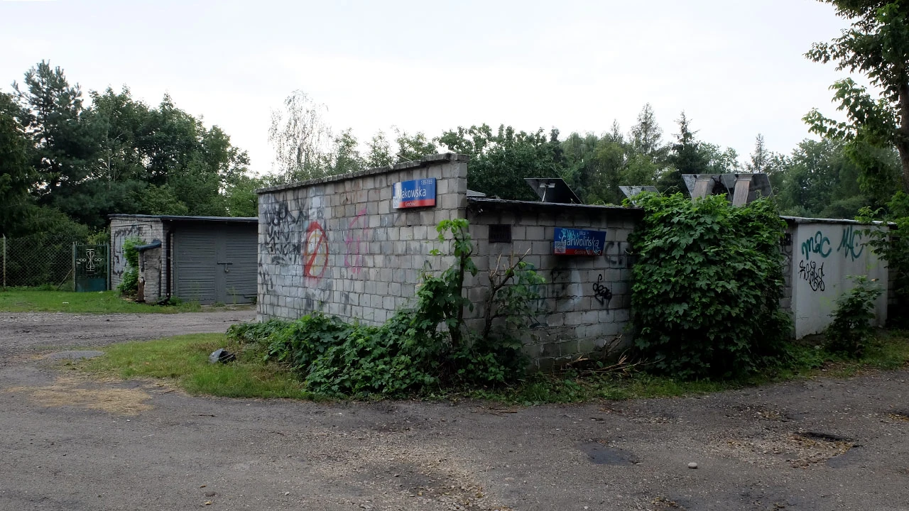 Przeciskamy się przez pokrzywy i mokrą od porannej rosy roślinność i wyjeżdżamy na Makowską pełną gębą. W zasadzie pełną garaży – bo choć na mapie widać przerywaną linię, to w rzeczywistości widać wyjazdy z garaży. Miejsce to jest swoistą galerią murali. Ale oferuje też rozrywkę bardziej dla ciała. Grillowanie pod garażami to chyba jednak objaw desperacji.