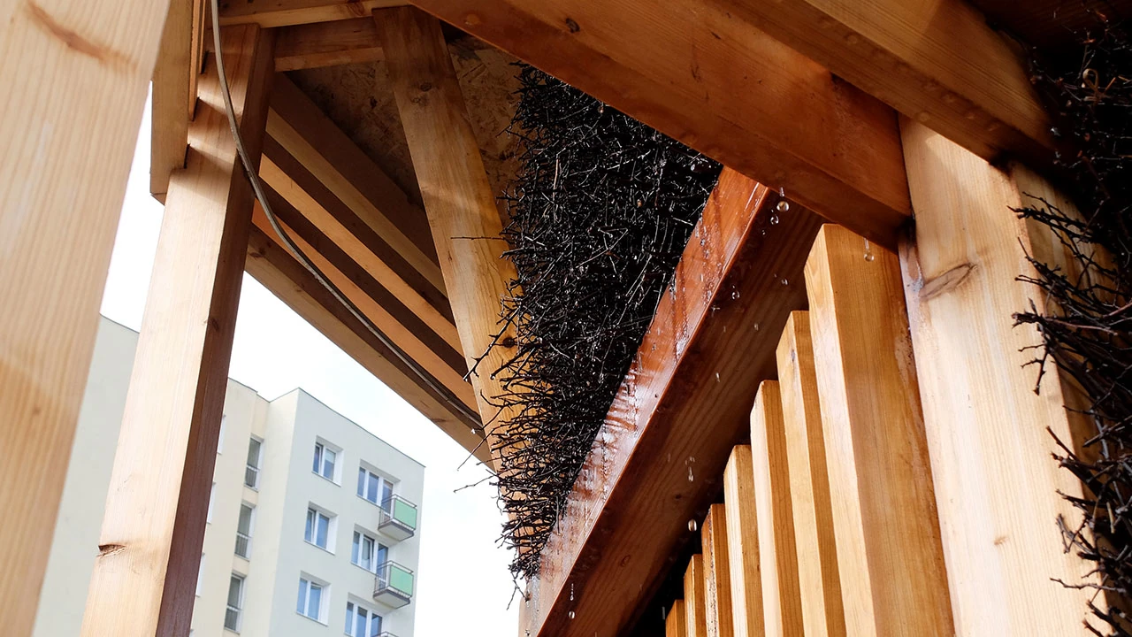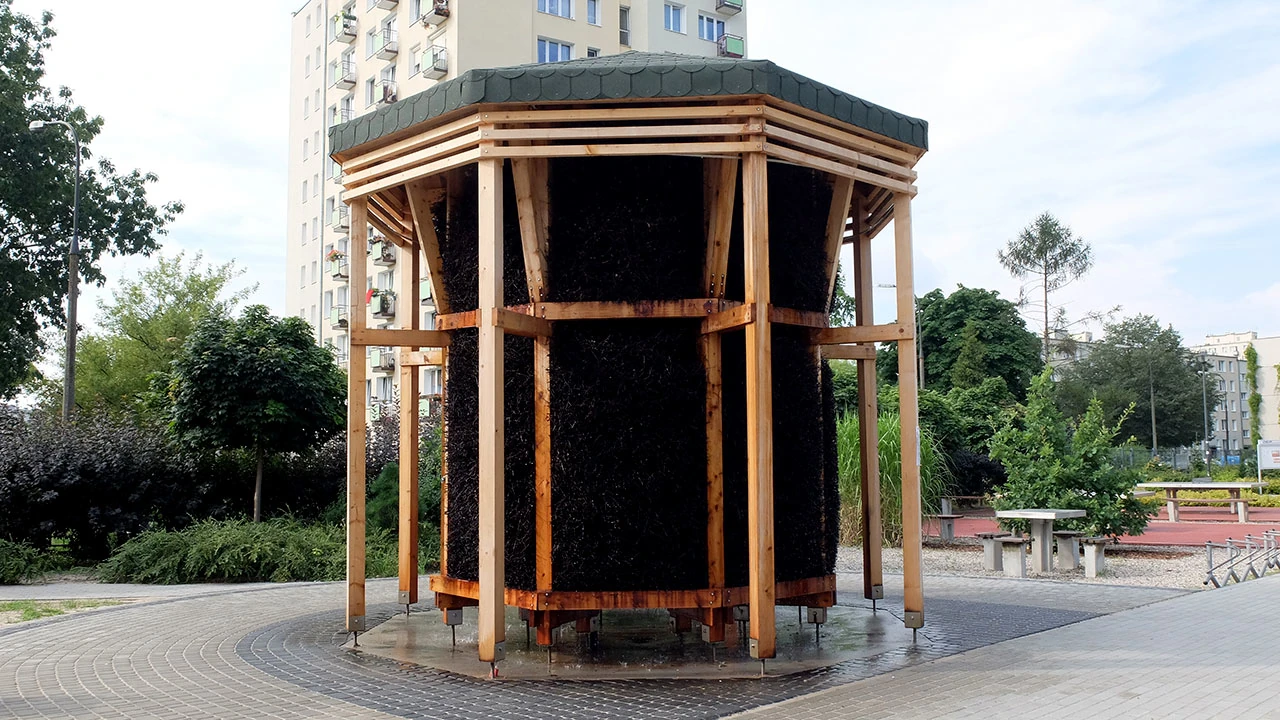 A niedawno postawiono tu mini tężnie. To super pomysł, szczególnie w upały, które ostatnio coraz częściej się zdarzają. Jesteśmy tu dość rano, tężnie pracują; na co dzień pojawiają się tu jeszcze metalowe krzesła, na których można przysiąść i napawać się lekkim chłodem i solankową aurą. To jakiś odlot patrzeć na tężnie w otoczeniu betonowych blokasów.