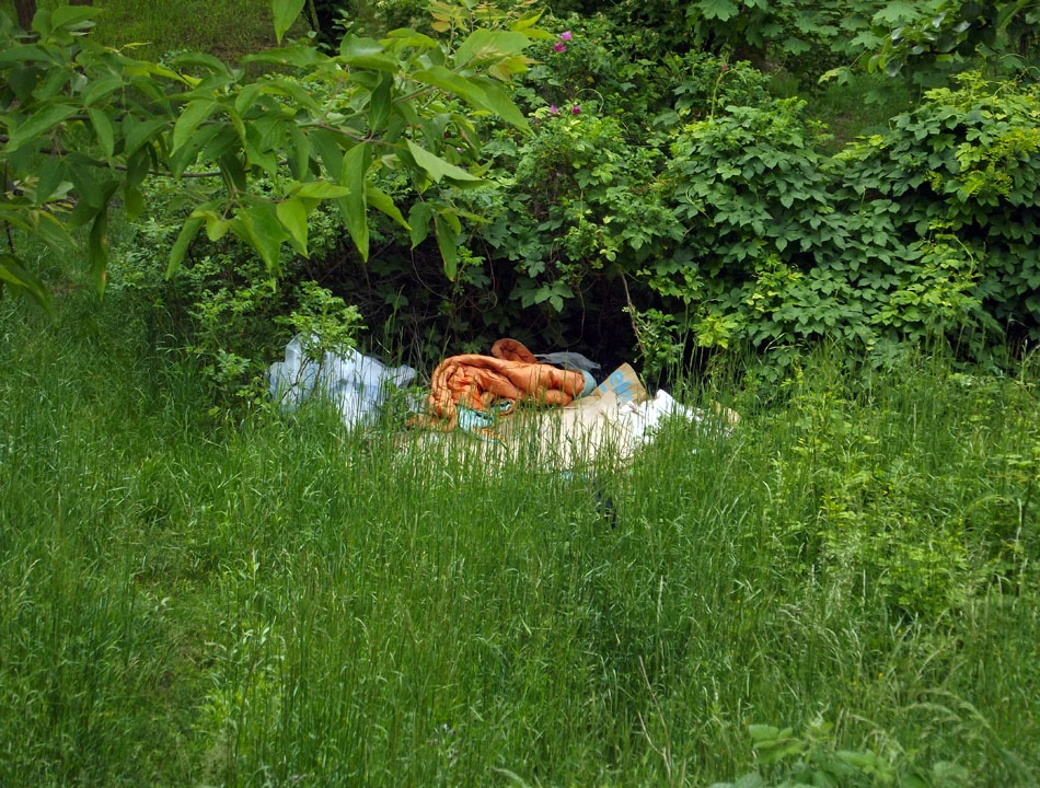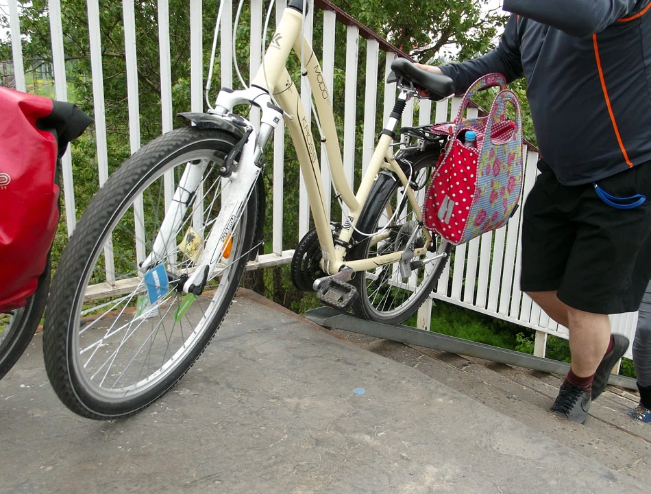 Jeden z celów naszej wycieczki już blisko. Przeskakujemy przez rondo i jedziemy chwilę Starzyńskiego. Potem na wysokości Namysłowskiej, przy przejściu dla pieszych, wspinamy się na nasyp kolejowy. Rowery zostawiamy przypięte do naturalnego w tej okolicy stojaka. Penetrujemy okolicę. Znajdujemy się w trójkącie utworzonym przez kilka nasypów kolejowych. Natrafiamy na kilka miejsc noclegowych pod chmurką, ale lokatorów nie spotykamy.