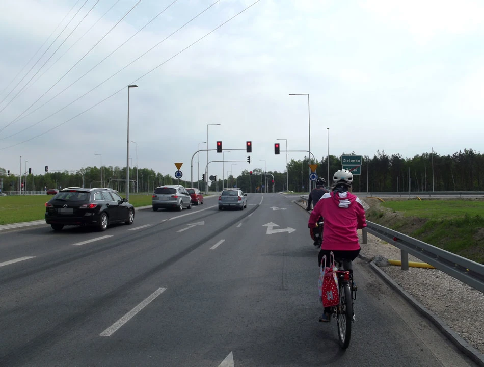 Kościeliską przekraczamy Radzymińską i dalej Płońską ruszamy w stronę Ząbek. Łodygową i Skorupki docieramy do Piłsudskiego. Ależ tu się zmieniło. Gdy byliśmy tu ostatnim razem, Piłsudskiego było jednopasmową drogą. Teraz to wielkie i wybetonowane skrzyżowanie. Jest nawet droga dla rowerów, ale tylko po jednej stronie arterii i nie tak łatwo się na nią dostać.