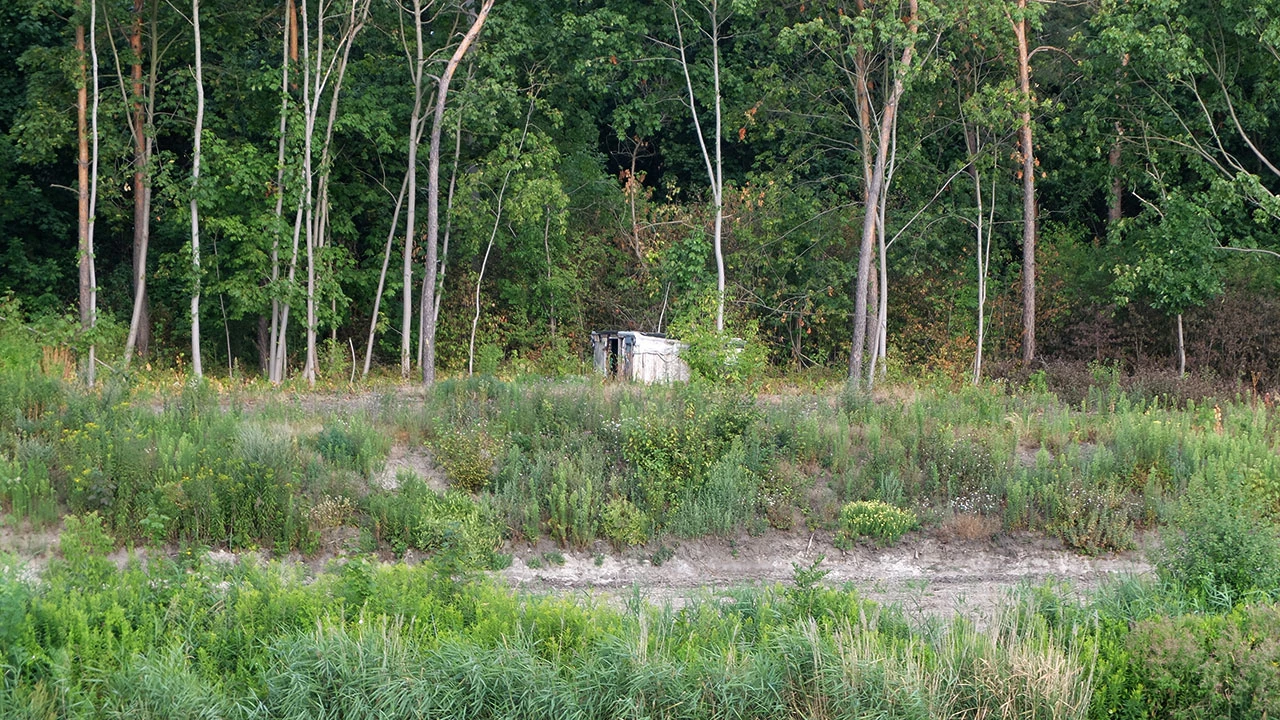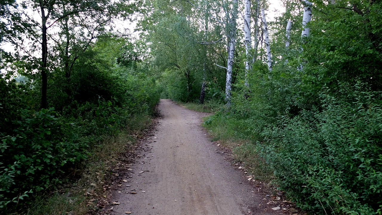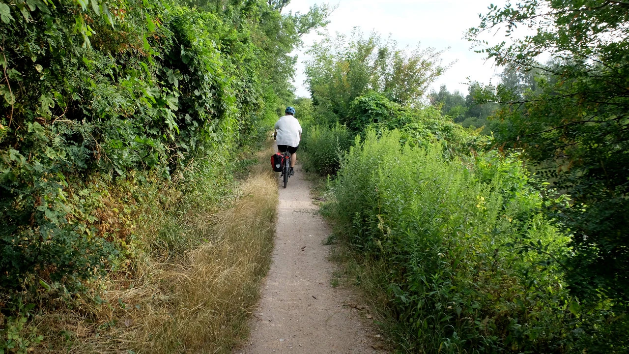 Przez furtkę od ulicy Annopol wjeżdżamy na wał nad Kanałem Żerańskim. Furtka ta sama co wtedy, ścieżka jednak jakby bardziej zarośnięta. Może nikomu nie chce się tędy jeździć ani chodzić? Nawierzchnia piaszczysta jak zawsze, chyba nie ma planu jej naprawiać. Jak to jest, że Niemcom chce się robić porządne drogi na wałach wzdłuż wody?