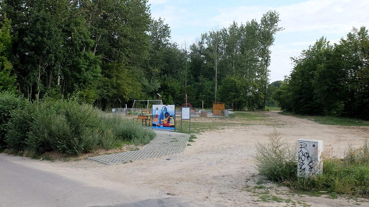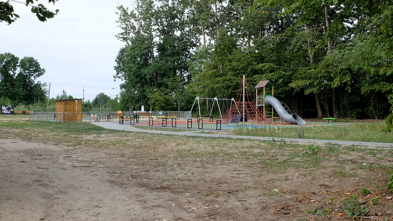 W pobliżu groźnej tablicy jest elegancki plac zabaw, nawet z elementami skate parku.