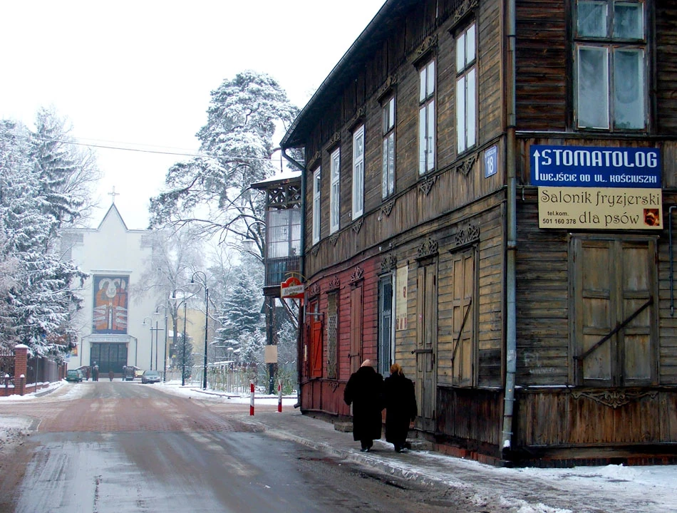 Chopina jedziemy do Reymonta, a potem Samorządową. Po drodze mijamy różnorodną zabudowę, nie tylko drewnianą.