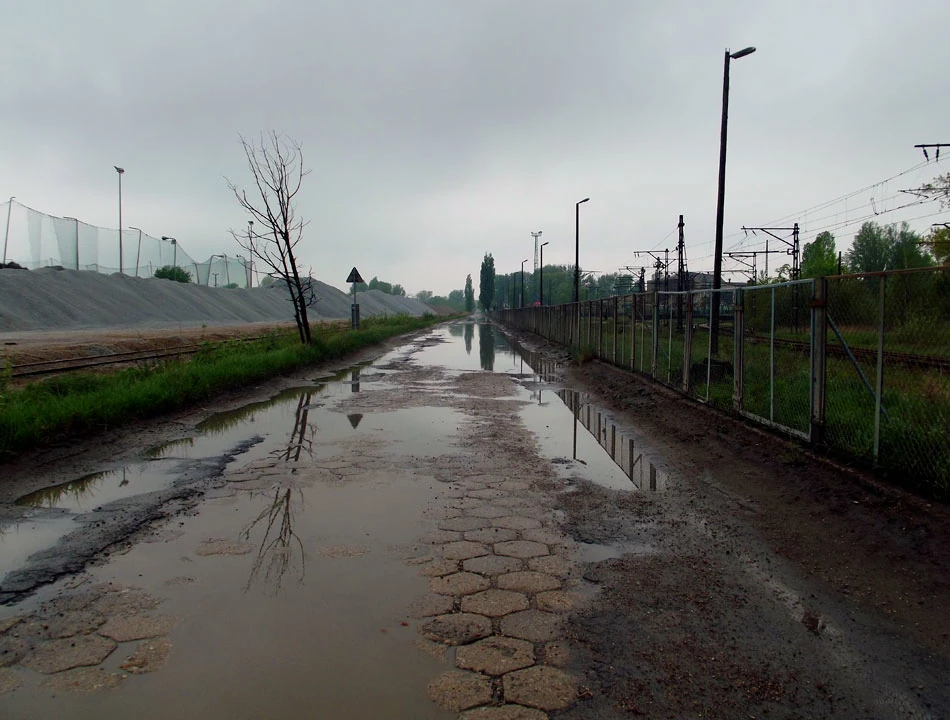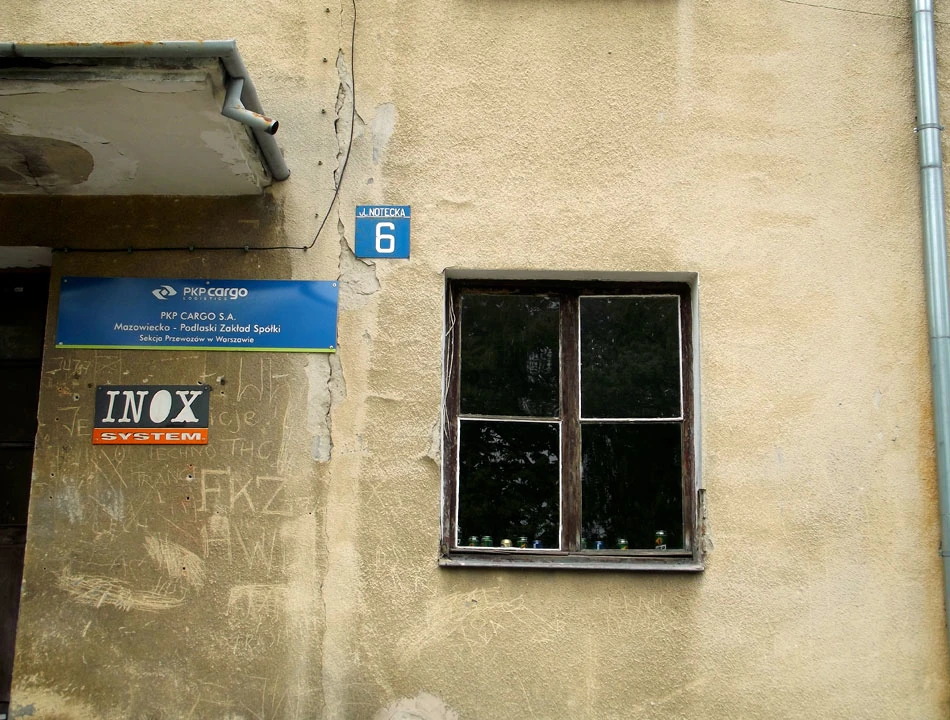 Przecinamy Dźwigową i od strony Noteckiej znowu wjeżdżamy na teren kolejowy. Posuwamy się równolegle do ulicy Fortuny. Do rangi symbolu stanu kolei polskich urasta wystawa w oknie jednego z budynków.